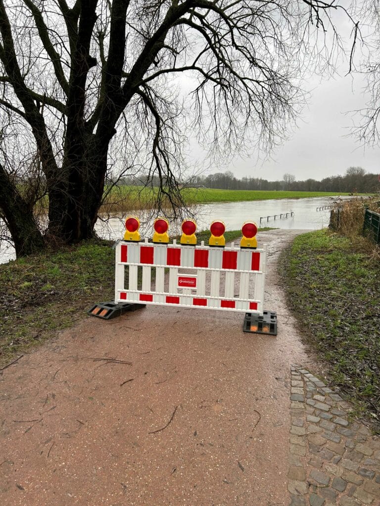 Den Wasserstand der Dinkel hat der Krisenstab der Stadt Gronau laufend im Blick. Am Tag vor Heiligabend (23. Dezember) trafen sich die Verantwortlichen von Stadt, Feuerwehr, Polizei, Abwasserwerk und THW zu zwei Krisenbesprechungen. Der Informationswert 1 ist im Dinkelbereich überschritten und ist momentan stagnierend. Zu den gesperrten Straßen und Radwegen gehören der Alfertring, die Bahnunterführung im Eper Park und der Dinkelpad entlang der Dinkel im Bereich der Oase.