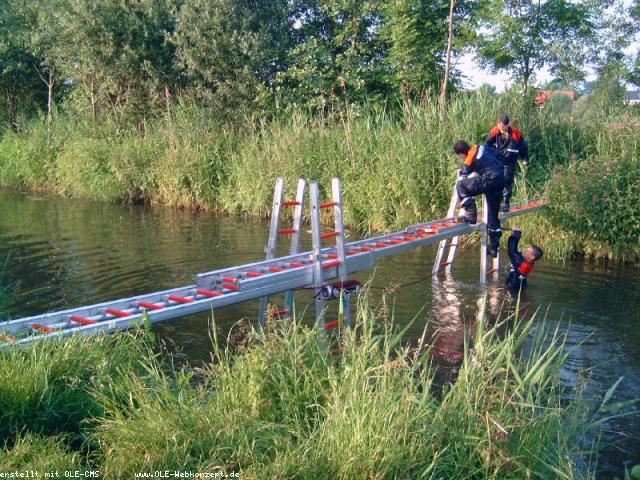 Es wurde beschlossen, dass mit Hilfe der Leitern und anderen Gegenständen des LF 16 TS eine Brücke über die Dinkel gebaut werden muss. Zwischendurch gab es für das gute Abschneiden beim Kreispokalturnier vom 23.05.04 (JF Gruppe Epe – 1. Platz) ein Eis spendiert. Nachdem das Lernziel erreicht, und die Brücke errichtet war, durften sich alle noch bei einer "Wasserschlacht" von der Hitze, die an diesem Tag herschte, abkühlen. Hier noch einige Bilder: