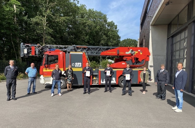 Mit Bastian Heim, Lukas Jager und Gunnar Wieking wurden jetzt drei Brandmeister der Feuerwehr Gronau befördert. Sie erhielten am 30. Juli 2021 aus den Händen der Ersten Beigeordneten der Stadt Gronau, Sandra Cichon, die Beförderungsurkunden zu Oberbrandmeistern.