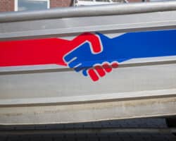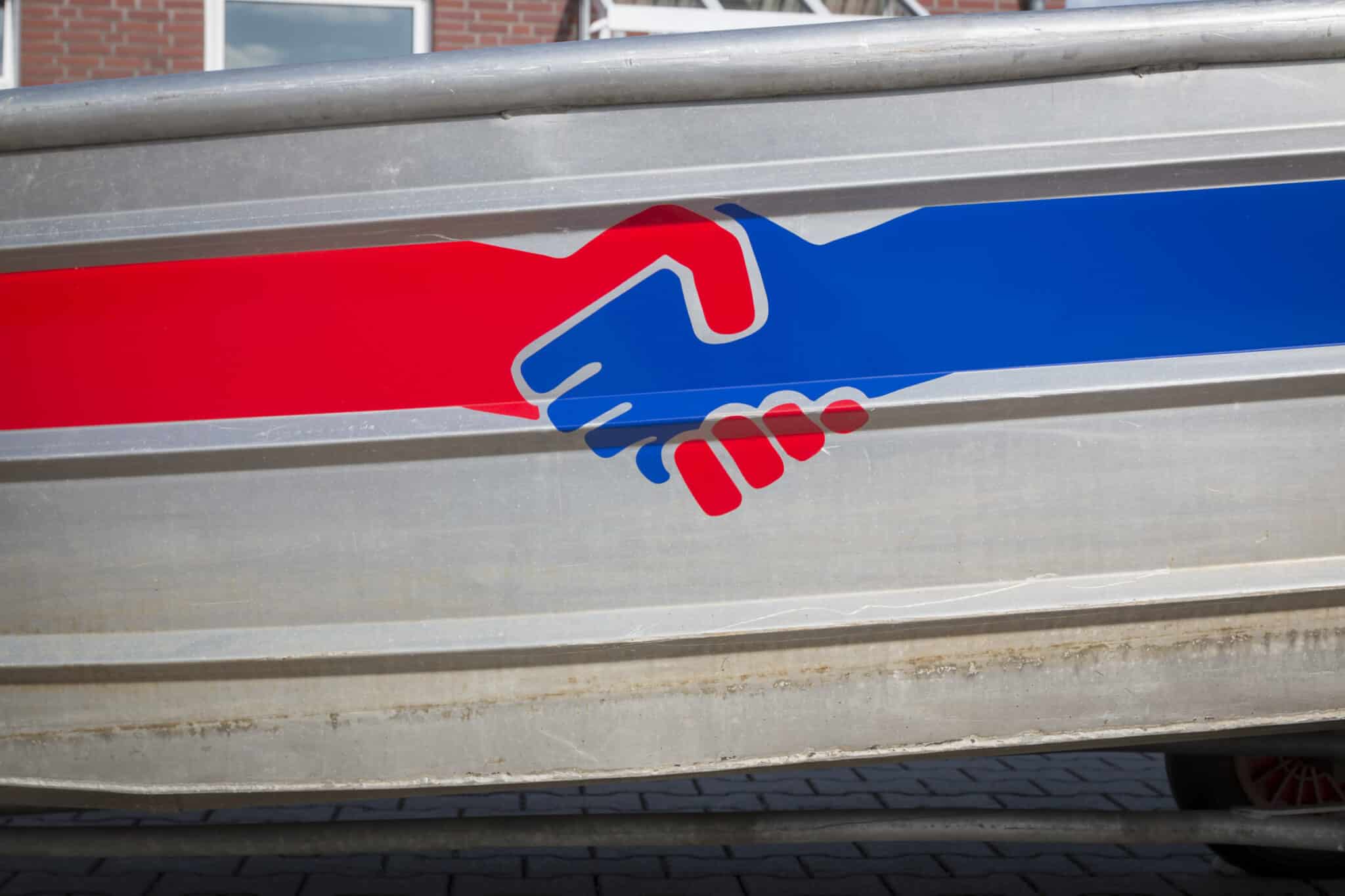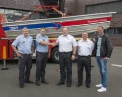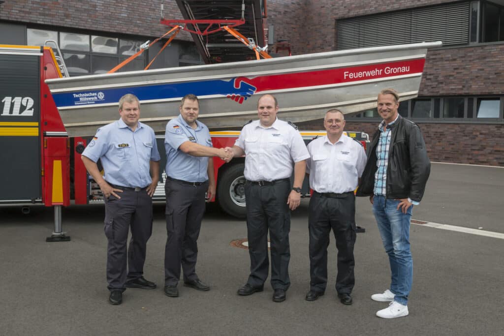 Die Feuerwehr und das Technische Hilfswerk (THW) in Gronau arbeiten schon seit längerem Hand in Hand. Bei Einsätzen sowieso, aber auch bei gemeinsamen Übungen, Ausbildungen und sogar bei Wettkämpfen. Nun kommt noch eine weitere Kooperation hinzu, nämlich auf dem Wasser. An der Feuer- und Rettungswache Gronau wurde eine Besonderheit vorgestellt, die es so noch nicht gab: ein gemeinsames Boot, das sowohl von der Feuerwehr als auch dem THW betrieben und verwendet wird. Die Grundidee geht auf Rainer Hoff, den Leiter des Fachdienstes Sicherheit und Ordnung der Stadt Gronau zurück. Optisch wird gleich ein ungewöhnliches, aber klares Zeichen gesetzt: der Bug des Rumpfes ist in Feuerwehr-rot foliert und trägt den Schriftzug „Feuerwehr Gronau“. Das Heck ist dagegen THW-blau und trägt das Zahnkranzlogo der Bundesorganisation. In der Mitte der Clou: eine blaue und eine rote Hand, die einander festhalten.