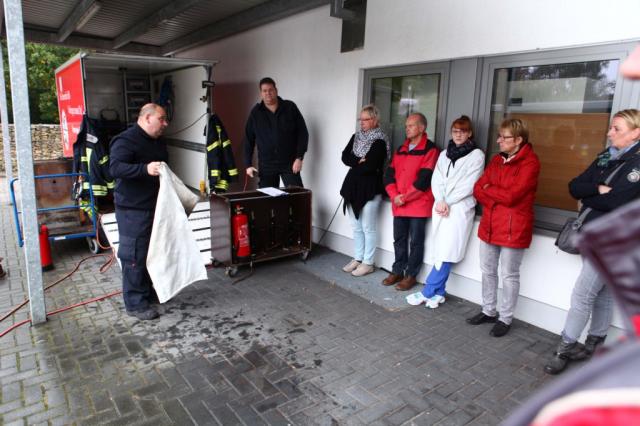 Sein Assistent, Stefan Bergmann vom Löschzug Epe, ergänzt: „Das eigentliche Löschen eines Brandes ist Aufgabe der Feuerwehr. Bei unseren Schulungen geht es darum, dass entstehende Kleinbrände unmittelbar selbständig bekämpft werden können, bevor mehr daraus wird. Wir als Feuerwehr sind auf jede Situation professionell vorbereitet, wenn wir eintreffen. Aber die ersten Minuten nach Entdeckung des Brandes sind entscheidend. Darum legen wir auch größten Wert darauf, dass wir als Partner verstanden werden und jeder den Sinn der jeweiligen Maßnahme versteht.“