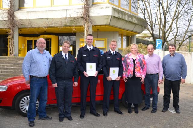 Foto: Bürgermeisterin Sonja Jürgens (3.v.r.) überrreichte jetzt die Ernennungsurkunden an die Brandmeisteranwärter Bernd Sibbing (3.v.l.) und Florian Herbst (M.). Der Leiter der Feuerwehr, Marco van Schelve (2v.l.), der stellvertretende Leiter des Fachdienstes Sichereheit und Ordnung, Christian Jansen (L.), Fachdienstleiter "Personal" Berthold Deitermann (2v.r.) und Personalratsvorsitzender Holger Krönke (r.) wünschten eine erfolgreiche Ausbildungszeit.