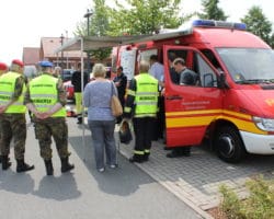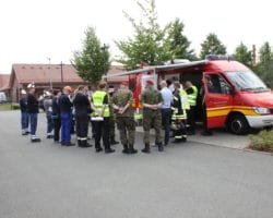 Verschiedene Beobachter kontrollieren alle Schritte dieser Übung und notierten etwaige Unstimmigkeiten Gerade die Führungskräfte müssen ihre Entscheidungen am Einsatzleitwagen erläutern. Sobald die Aufgaben abgearbeitet wurden ist das Ende der Übung eingeläutet. . Geladen zu dieser Übung waren auch Vertreter der Bundeswehr, die bei großen Einsätzen (Waldbrand, Hochwasser, etc.) schon öfters mit den Feuerwehren zusammen gearbeitet haben.