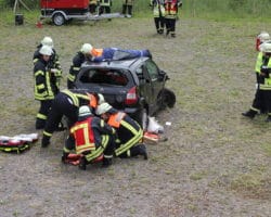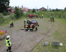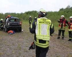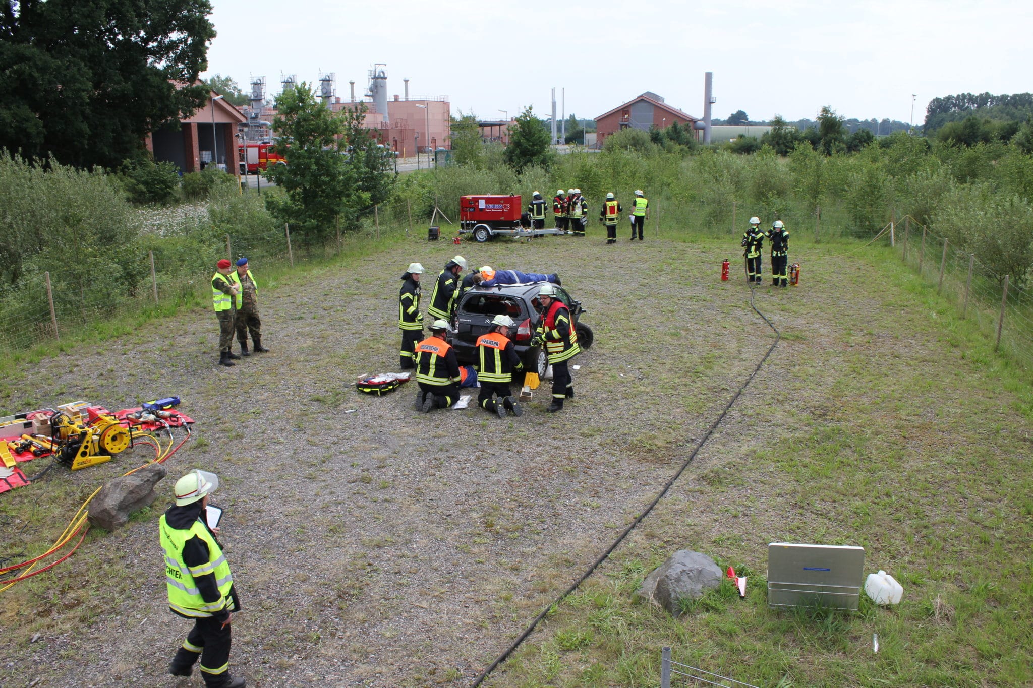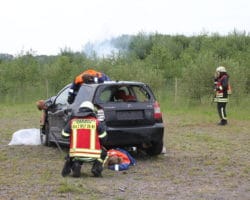 Das ein Hubschrauber abstürzt und das auf dem Gelände der Firma Trianel, den angrenzenden Wald in Brand setzt und zwei Arbeiter verletzt sind und sich nicht selber befreien können, war die Aufgabe, die die Planer der Übung sich ausgedacht haben. Der Hubschrauber war durch ein Unfall-PKW dargestellt und die Waldbrände wurden mit großen Nebelmaschinen simuliert. Die Firma Trianel, so der Betriebsleiter Herr Pauly, wollte mit der Übung auch ein internes Notfallsystem testen.