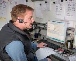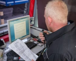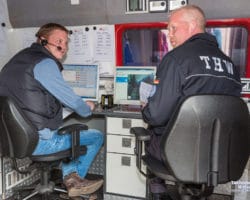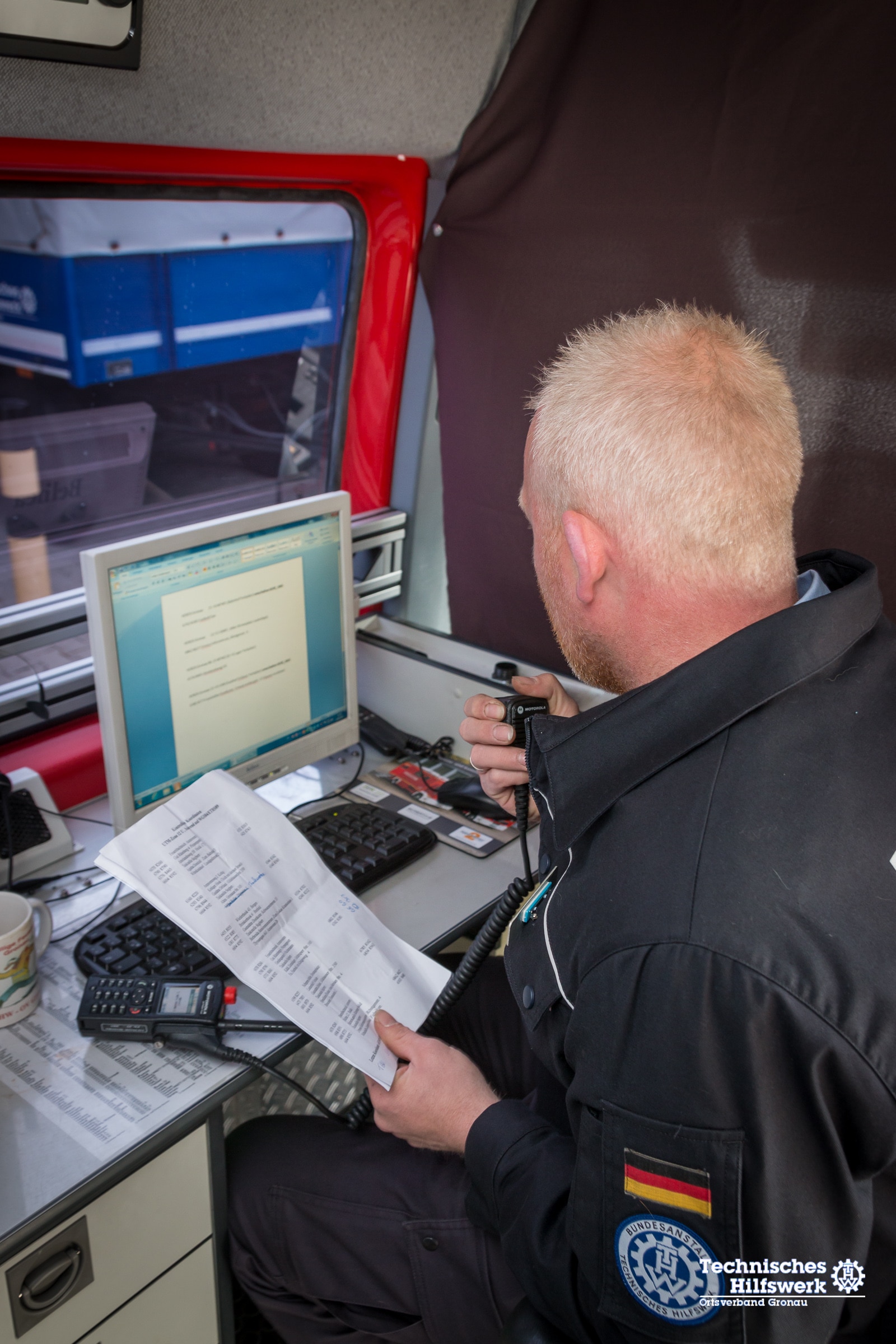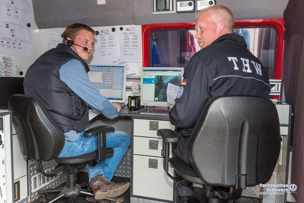 Die beiden Feuerwehr-Ausbilder David Meyer und Benjamin Rosprim vom Löschzug Gronau führten am Samstag, dem 22. April 2017 durch den Tag und unterwiesen die 12 Gronauer THWler in die Feinheiten des Sprechfunks der „BOS“ („Behörden und Organisationen mit Sicherheitsaufgaben“). Mitgebracht hatten die beiden den „ELW“, den Einsatzleitwagen der Feuerwehr Gronau, ein rollendes Einsatzbüro mit modernster Kommunikations- und Führungstechnik.