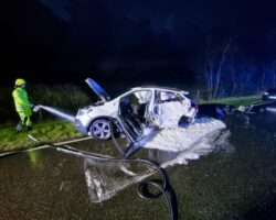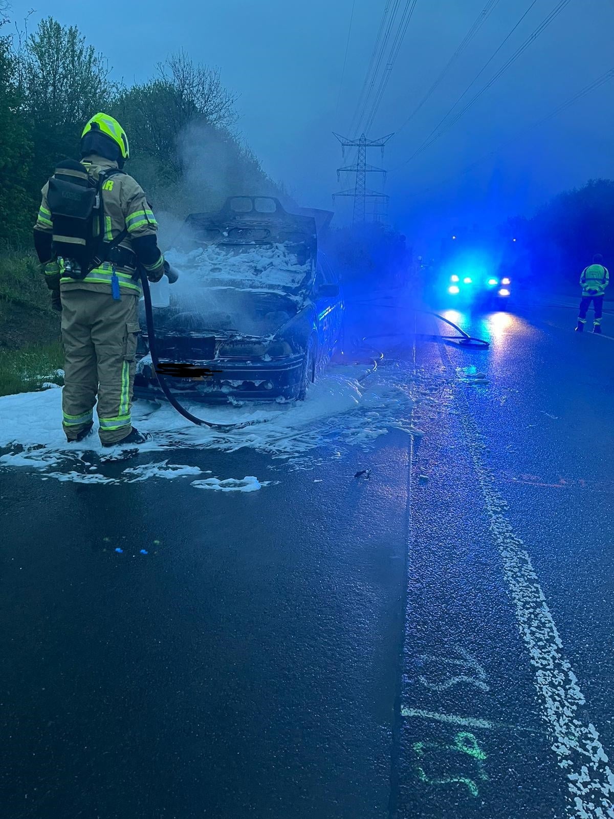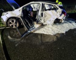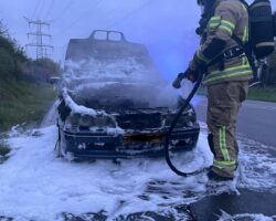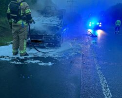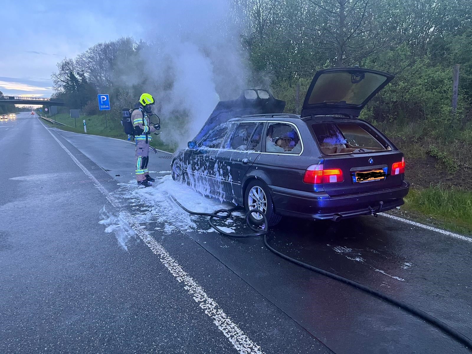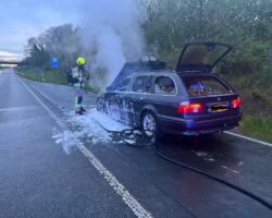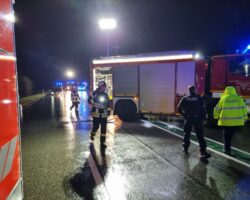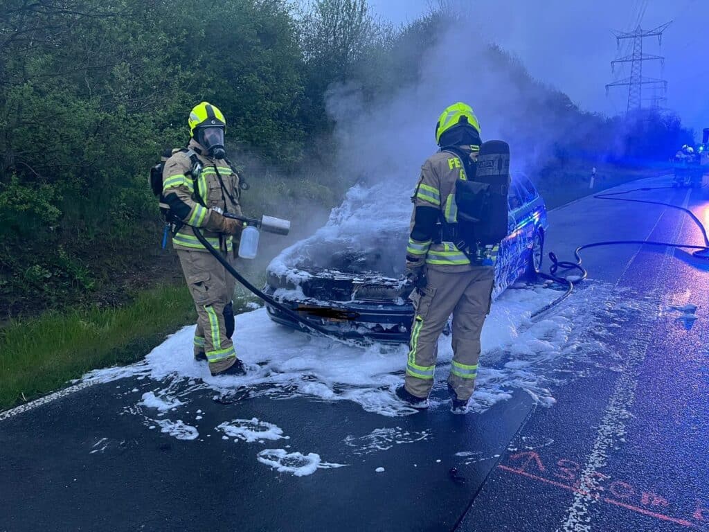 Am 23.04.2023 fing der Motorbereich eines PKW an zu brennen. Die 4 Insassen konnten den PKW unverletzt verlassen. Der PKW wurde abgelöscht und die Abstellfläche gereinigt. Durch den Motorbrand entstand eine ca. 1200 Meter lange Dieselspur, die beseitigt werden musste.