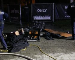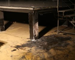 Der Angriffstrupp konnte schnell den Brandherd ausfindig machen. Im Bereich Bühne waren ein Tisch sowie eine Rücksitzbank eines Fahrzeuges in Brand geraten. Die Feuerwehr beförderte das Brandgut nach Außen und löschte die Gegenstände mit einem C-Rohr ab.