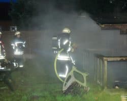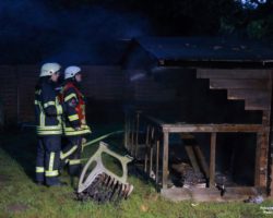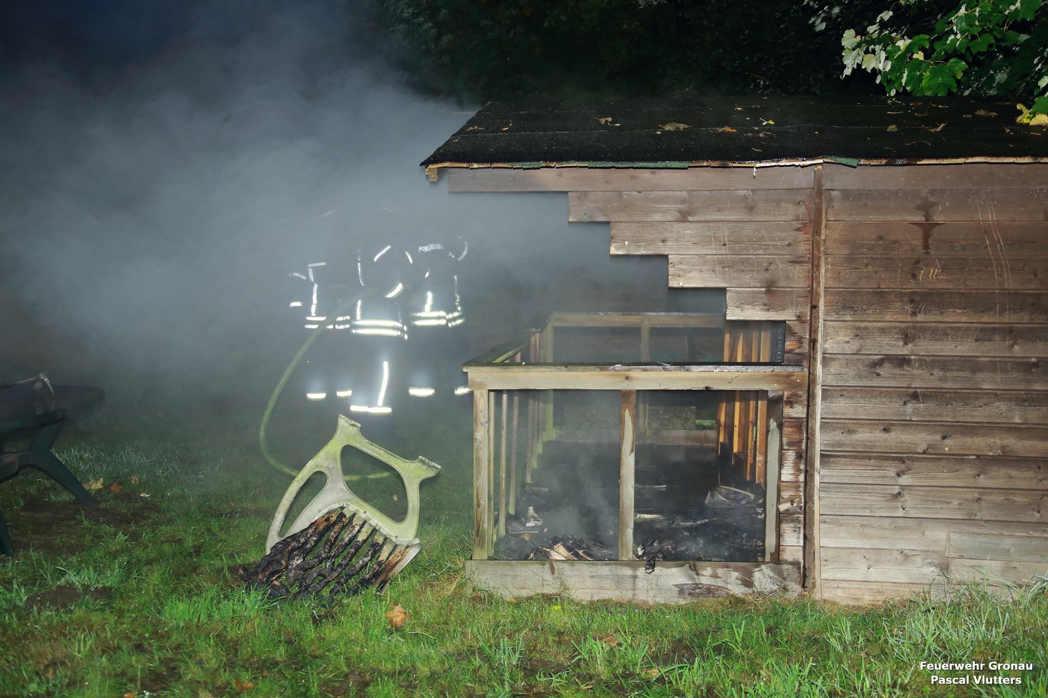 Kurz vor 07:00 h bemerkten Anwohner der Enscheder Straße den Brand einer Gartenhütte. Sie alarmierten die Feuerwehr und begannen selbst mit Löscharbeiten. Nach Eintreffen der Feuerwehr wurde der Brand mit einem C-Rohr unter Atemschutz gelöscht. Fotos: Feuerwehr Gronau (Pascal Vlutters)