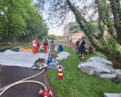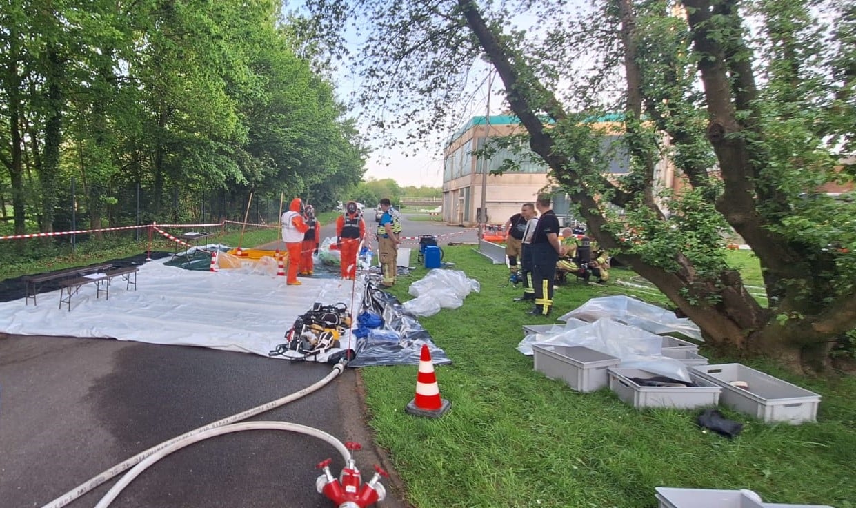 Am Abend des 01. Mai kam es gegen 18 Uhr zu einem Austritt einer vorerst unbekannten Flüssigkeit im Bereich des Abwasserwerks. Bei der ersten Erkundung durch die Feuerwehr, die durch Mitarbeiter des Abwasserwerks unterstützt wurde, konnte der austretende Stoff identifiziert werden. Diese Chemikalie, welche für den Klärprozess benötigt wird, reagiert in hohen Konzentrationen heftig mit verschiedenen Metallen, so auch in diesem Fall.