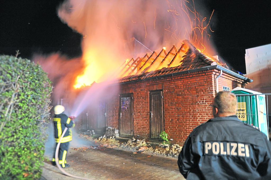 Als Anwohner durch feuertypische Geräusche geweckt wurden, stand der Dachstuhl eines Geräteschuppens schon lichterloh in Flammen.