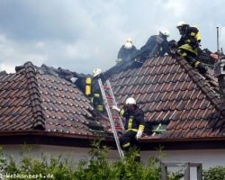 12:55 Uhr, kurz nach dem Essen: Feuer 3, Dachstuhlbrand in der Schuchartstrasse. Dichter Rauch quoll den ersten Einsatzkräften entgegen. Das erste Rohr im Innenangriff musste bald zurückgenommen werden, da die Innenverkleidung auf die Einsatzkräfte stürzte. Dank der geringen Bauhöhe konnte mit Steckleitern von allen Seiten der Brand gut erreicht werden. Nach ca. 2 Stunden waren die Löschzüge der Feuerwehr wieder eingerückt.
