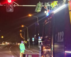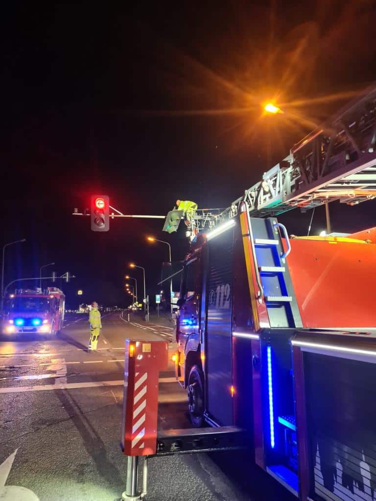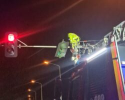 28.07.22 An der Ochtruper Str. drohte das Lichtzeichen einer Ampel herabzufallen. Aus dem Korb der Drehleiter konnte das Lichtzeichen wieder befestigt werden.