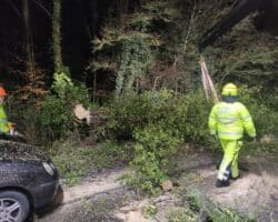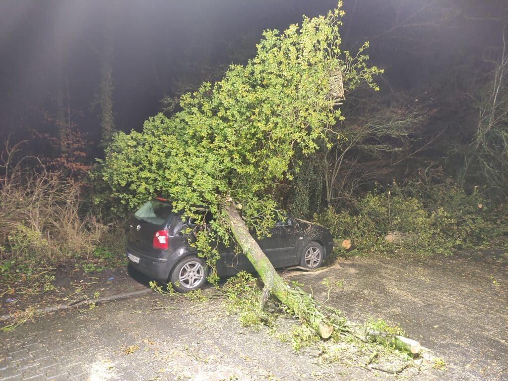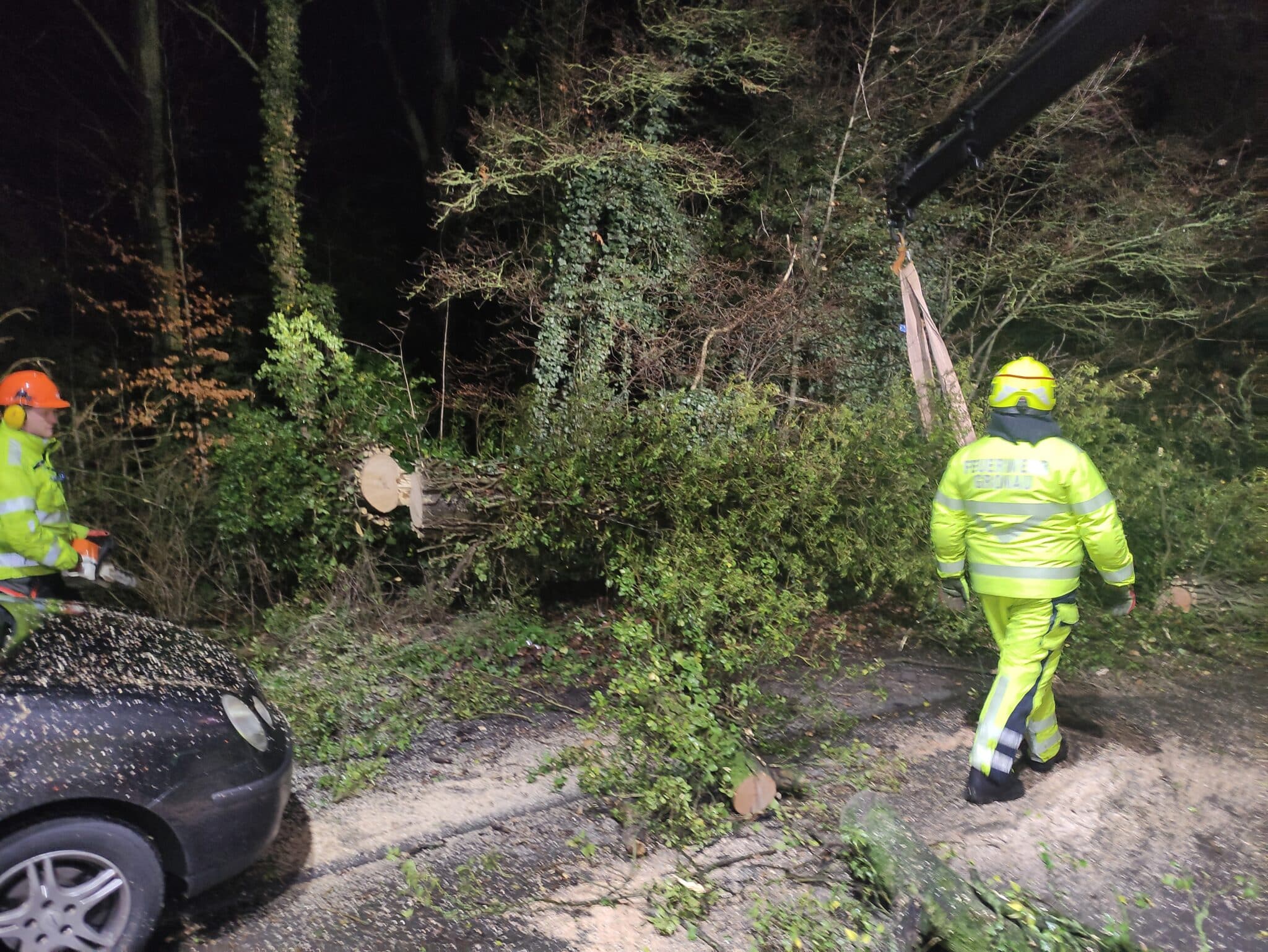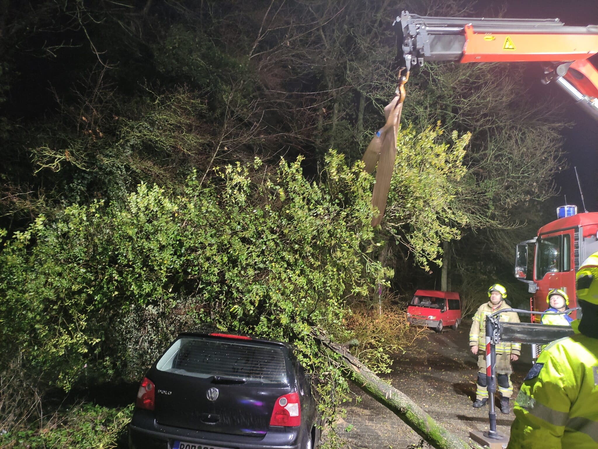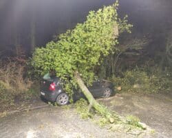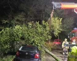 Um 21:32 Uhr wurden wir zur Petersburg in Epe alarmiert. Vermutlich ist durch aufgeweichtes Erdreich ein ca. 15 m langer Baum umgestürzt und hat dabei einen am Straßenrand geparkten Pkw unter sich begraben. Mit einer Motorsäge und der nachgeforderten Drehleiter wurde der Baum sukzessive zurückgeschnitten. Im weiteren Verlauf wurde das Wechseladerfahrzeug mit Kran aus Epe nachgefordert, um den Baumstamm vom Pkw anzuheben um den Pkw darunter wegrollen zu können. Der Rückschnitt wurde an den Straßenrand gelegt und provisorisch mit Absperrband gesichert.