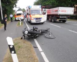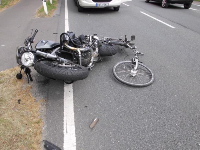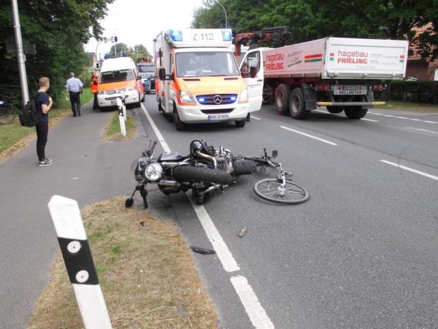 Heute befuhr ein 15 jähriger Radfahrer aus Gronau gegen 11:15 h die Schillerstraße in Richtung Gronauer Straße und beabsichtigte, die Fahrbahn der Gronauer Straße zu überqueren, und den falschen "linken" Radweg in Richtung Gronau zu befahren. Dabei achtete er nicht auf die Vorfahrt eines 58 – jährigen Motorradfahrers aus Nijmegen, der die Gronauer Straße in Richtung Epe befuhr. Es kam zum Zusammenstoß, bei dem der Radfahrer von seinem Fahrrad geschleudert wurde. Auch der Niederländer kam zu Fall. Beide Unfalbeteiligten verletzten sich leicht und mussten zur ambulanten Behandlung vom Rettungsdienst ins Krankenhaus gebracht werden. Der Sachschaden wird mit etwa 1.200 Euro angegeben.