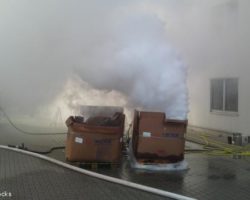 Bei Eintreffen der ersten Fahrzeuge bei der Firma Nordenia stellte sich heraus das dort im Außenbereich 2 Behälter mit Kunststoffgranulat brannten.