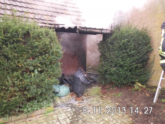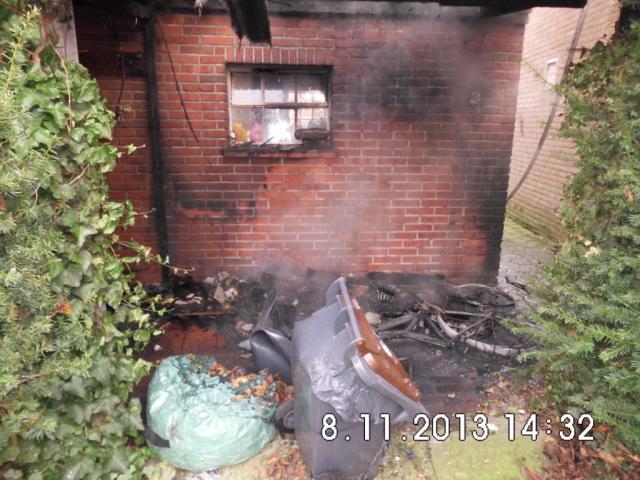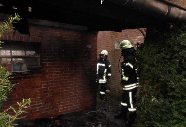 Mehrere Anwohner hatten gegen 14:14 Uhr laute Knallgeräusche gehört, Rauch gesehen und über die Notrufnummer 112 die Feuerwehr gerufen. Beim Eintreffen der Feuerwehr an der Einsatzstelle (In den Kämpen) brannten in einem Anbau Mülleimer, Gelbe Säcke, Europaletten, ein Fahrrad und sonstige verschiedene Gegenstände. Die Feuerwehr löschte den Brand mit einem C-Rohr durch einen Trupp unter Atemschutz. Mittels Wärmebildkamera wurden Glutnester sowie Übergänge zu Nachbargebäuden kontrolliert. Der Sachschaden wird mit ca. 10.000,– Euro angegeben. Die Brandursache wird durch die Polizei ermittelt.