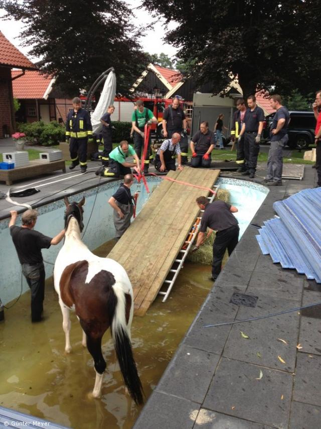 Ein nicht alltäglicher Einsatz beschäftigte am 05.07.12 die Feuerwehr Gronau. Gegen 15:30 h alarmierten Mitarbeiter eines landwirtschaftlichen Betriebes die Feuerwehr Gronau. Eines ihrer Pferde sei ausgebüxt und in den am Wohnhaus angrenzendem Swimmingpool gefallen. Bei Eintreffen stellten die Einsatzkräfte fest, dass ein dreijähriges Pferd in dem 1,5 m tiefen Pool stand. Mit zwei Tauchpumpen wurde das Wasser herausgepumpt. Gleichzeitig konnte eine niederländische Tierärztin verständigt werden, die während der gesamten Rettung die medizinische Versorgung des Pferdes übernahm. Nachdem der Pool so gut wie trocken gelegt worden war, konnte mit dem Bau der Rampe begonnen werden. Als Unterbau fungierten gepresste Heuballen. Mit Gerüstteilen sowie Holzbohlen wurde ein tragfähiger Laufsteg gebaut. Durch Festzurren mit verschiedenen Spanngurten wurde die Rampe gesichert. Um ein Ausrutschen des Pferdes zu verhindern, wurden auf der Lauffläche weitere Querhölzer aufgebracht und Heu verteilt. Mit Können und Geschick wurde dann das Pferd von einem Mitarbeiter aus dem Pool geführt. Ein erster medizinischer Check ergab, dass außer ein paar Abschürfungen das Pferd den Unfall gut überstanden hat.