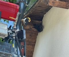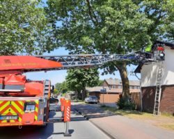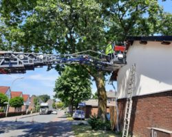 Im First eines Hauses steckte ein Vogel mit seinen Krallen in der Dämmung fest und konnte sich nicht befreien. Die Feuerwehr setzte die Drehleiter ein und rettete das Tier aus seiner misslichen Lage. Der Anruferin wurde das Tier übergeben. Sie teilte mit, dass sie das offensichtlich verletzte Tier, unverzüglich einem Tierarzt vorstellen werde.