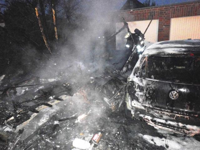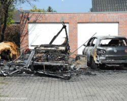 Um 04:53 h ging die erste Meldung bei der Kreisleitstelle in Borken ein. Ein Wohnwagen solle direkt an einem Gebäude "Auf der Sunhaar" brennen. Schon auf der Anfahrt zur Einsatzstelle wurde der Feuerwehr eine vermutlich zweite Einsatzstelle auch "Auf der Sunhaar" gemeldet. Bei Eintreffen auf der besagten Straße bot sich folgendes Bild: Im Bereich der Haus-Nr. 28 brannte ein Wohnwagen sowie ein daneben abgestellter PKW in voller Ausdehnung. Einige Häuser weiter, Höhe Haus-Nr. 46, stand ebenfalls ein PKW in Vollbrand. Weitere Anwohner machten die Feuerwehr darauf aufmerksam, dass im Bereich "Am Friedhof" ebenfalls ein PKW brenne. Während der Löscharbeiten meldeten sich die Besitzer eines Kleintransporters, der auch "Am Friedhof" stand. Dieses Fahrzeug hatte im vorderen Bereich gebrannt. Das Feuer konnte vom Eigentümer selbst gelöscht werden. Beim brennenden Wohnwagen wurde von der Feuerwehr eine Propangasflasche in Sicherheit gebracht. Alle brennenden Fahrzeuge wurden mit Wasser bzw. Schaummittel unter schwerem Atemschutz gelöscht. 45 Feuerwehrleute waren im Einsatz. Die Polizei geht bei der Anzahl von PKW-Bränden zur Zeit von Brandstiftung aus und ermittelt  auch in dieser Richtung. Der Sachschaden wird mit mindestens 50.000 Euro angegeben.