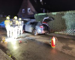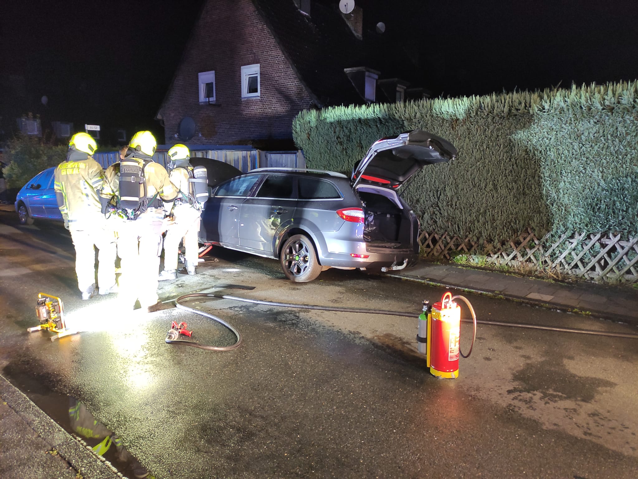 Auf der „Bögeholdstraße“ stand ein Ford Mondeo, der im Innenraum komplett verraucht war. Die Feuerwehr öffnete das Fahrzeug um den Brandrauch entweichen zu lassen. Der Angriffstrupp stellte dann im Fußraum auf der Fahrerseite glimmende Fußmatten fest. Diese wurden aus dem Fahrzeug entfernt und abgelöscht. Da die Temperatur im Fahrzeug, speziell im Fußbereich sehr hoch war, wurde dieser ebenfalls mit einem C-Rohr abgelöscht. Mittels Wärmebildkamera wurden Temperaturen von über 500 Grad Celius gemessen. Durch den Einsatz eines Wagenhebers wurde das Fahrzeug angehoben um den Untergrund zu kontrollieren. Hier gab es keine Feststellungen. Weiterhin klemmte die Feuerwehr die Batterie ab.