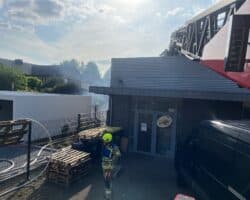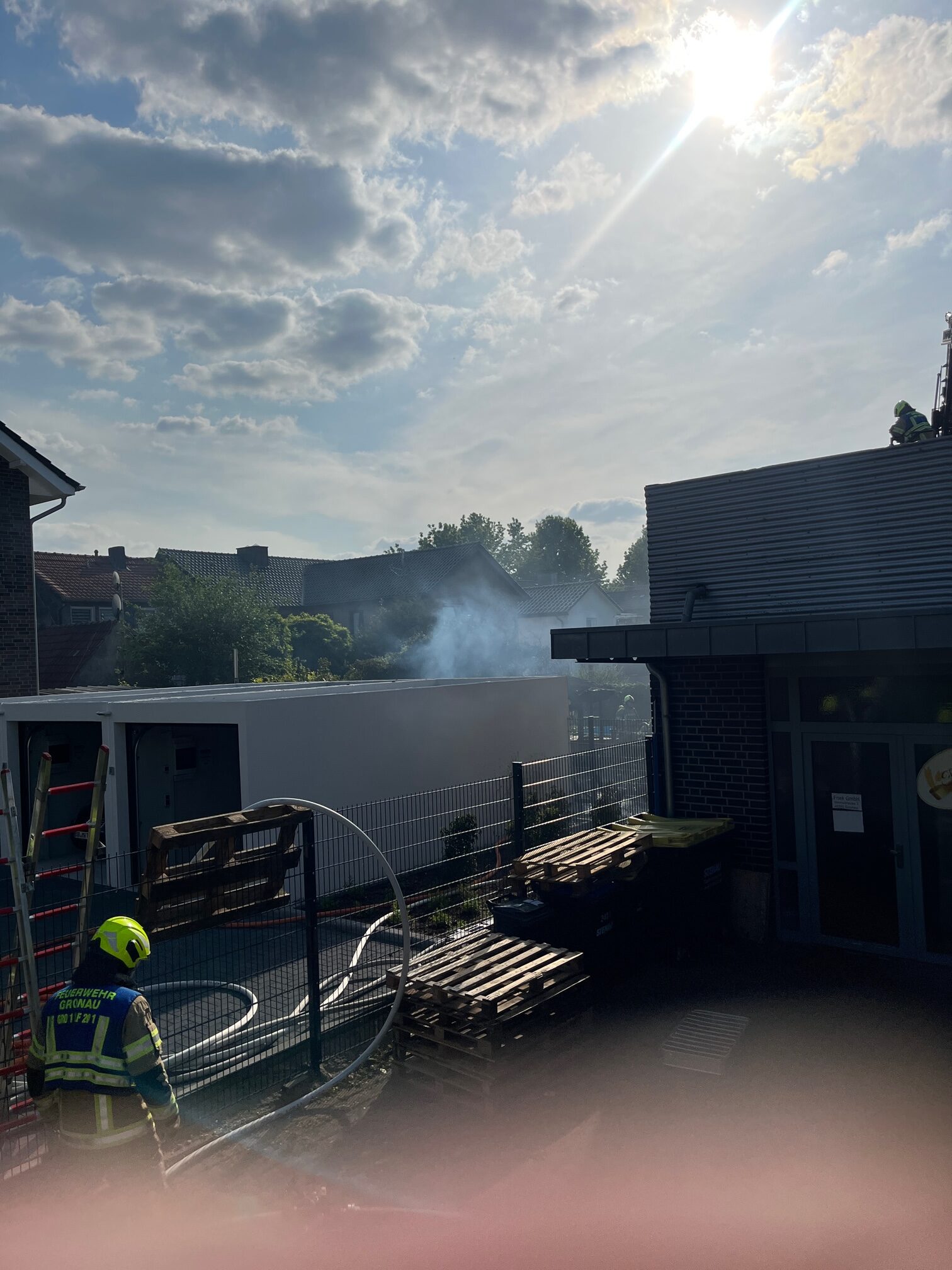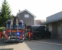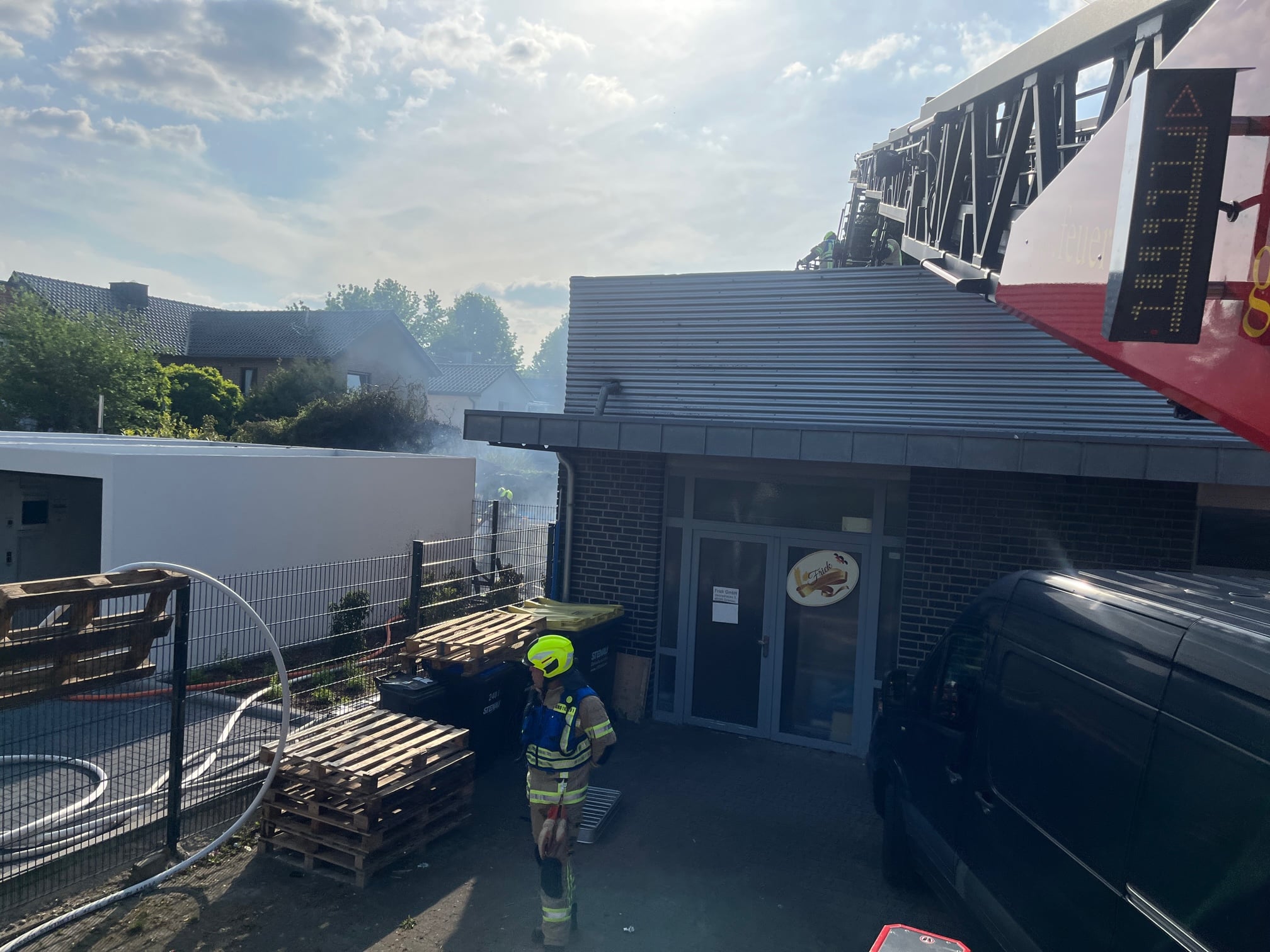 Auf dem Dach der Bäckerei wurde über die Drehleiter eine hochgewachsene Hecke abgelöscht werden. Einige Platten der umlaufenden Verkleidung mussten entfernt werden, um auch hier eine Brandausbreitung auszuschliessen. Die Räume der Bäckerei wurden ebenfalls kontrolliert und das Dach abschließend mit der Wärmebildkamera kontrolliert.