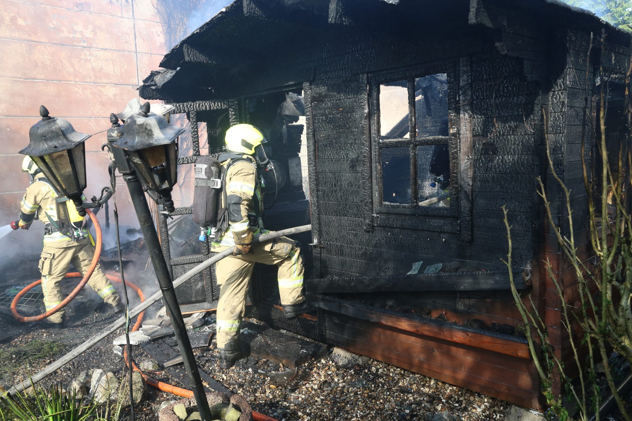 Nach dem Eintreffen wurde festgestellt, das eine Gartenhütte auf einem Nachbargrundstück in voller Ausdehnung brannte.
