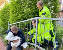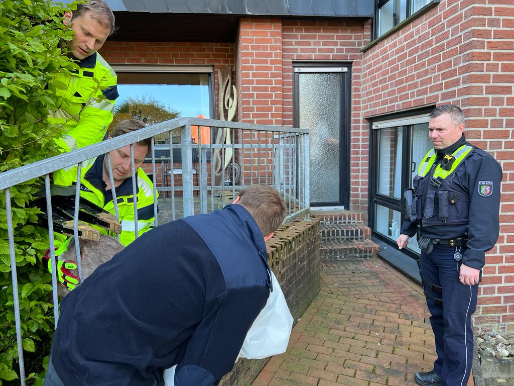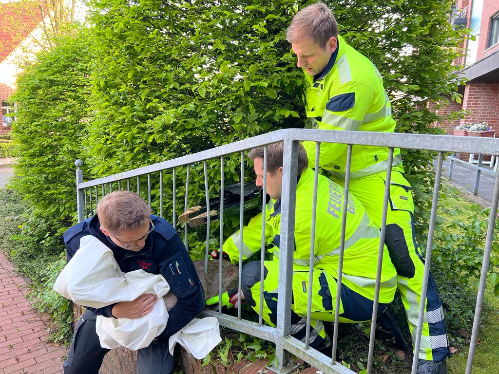 Gegen 9 Uhr rettete die Feuerwehr Gronau zunächst ein in einem Zaun feststeckendes Reh am St. Agatha Domizil in Epe. Mit dem hydraulischen Spreizer wurden die Gitterstäbe des Zauns auseinandergebogen und so das Reh befreit. Das Reh entließen die Einsatzkräfte danach in die Freiheit.