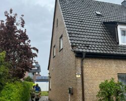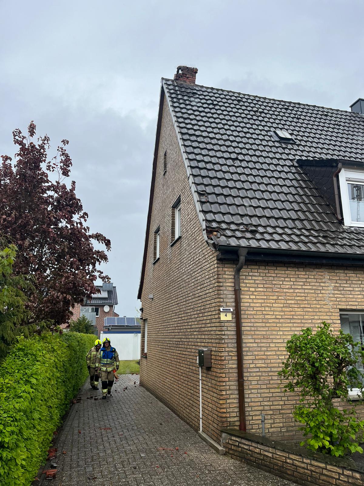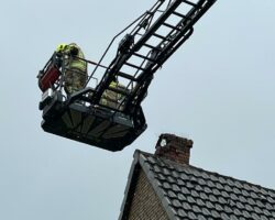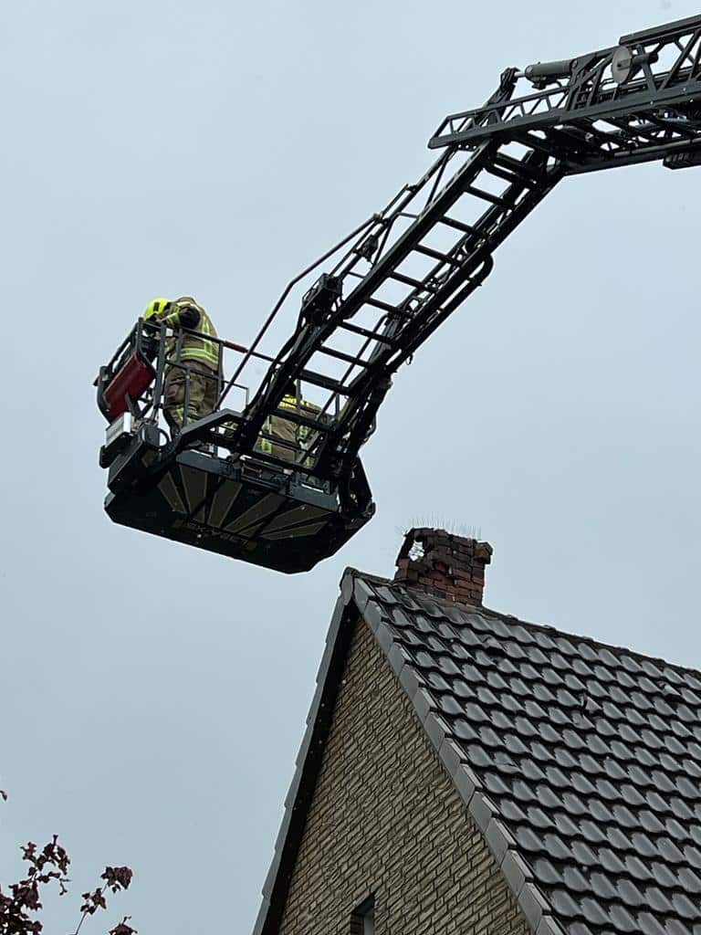 Am Nachmittag mussten die Kameraden erneut ausrücken. Durch einen Blitzeinschlag hatte ein Schornstein so Schaden genommen, dass Ziegelsteine drohten herunterzufallen. Mit der Drehleiter wurden die losen Steine gesichert und der Schornstein zur Sicherheit abgetragen.
