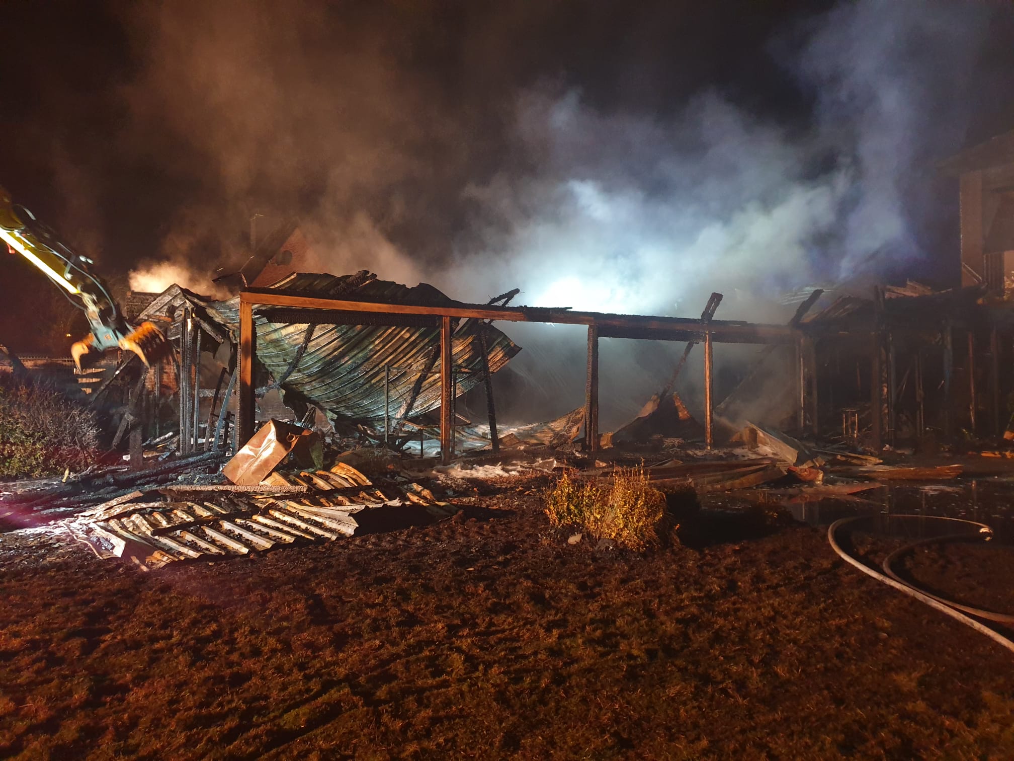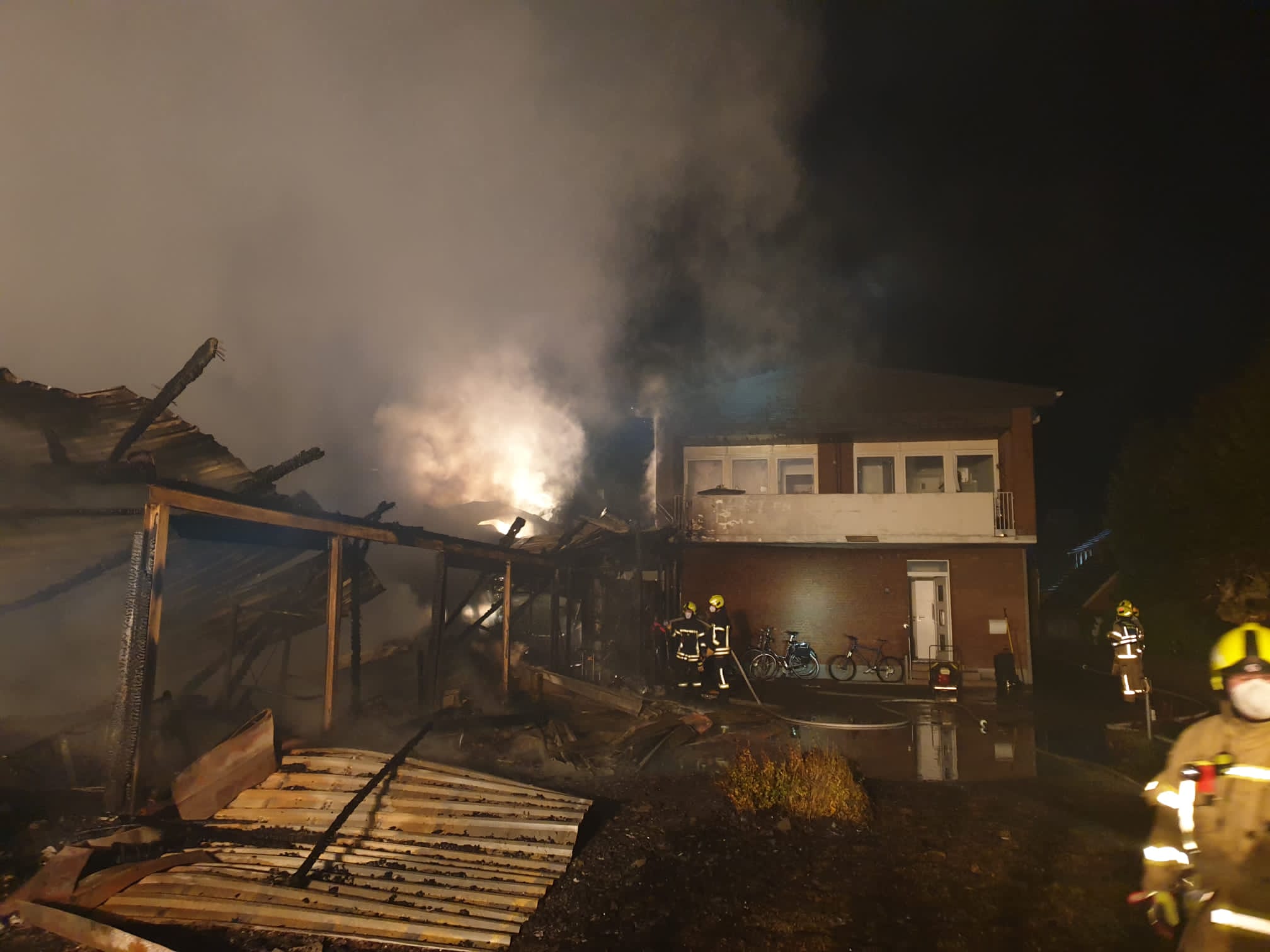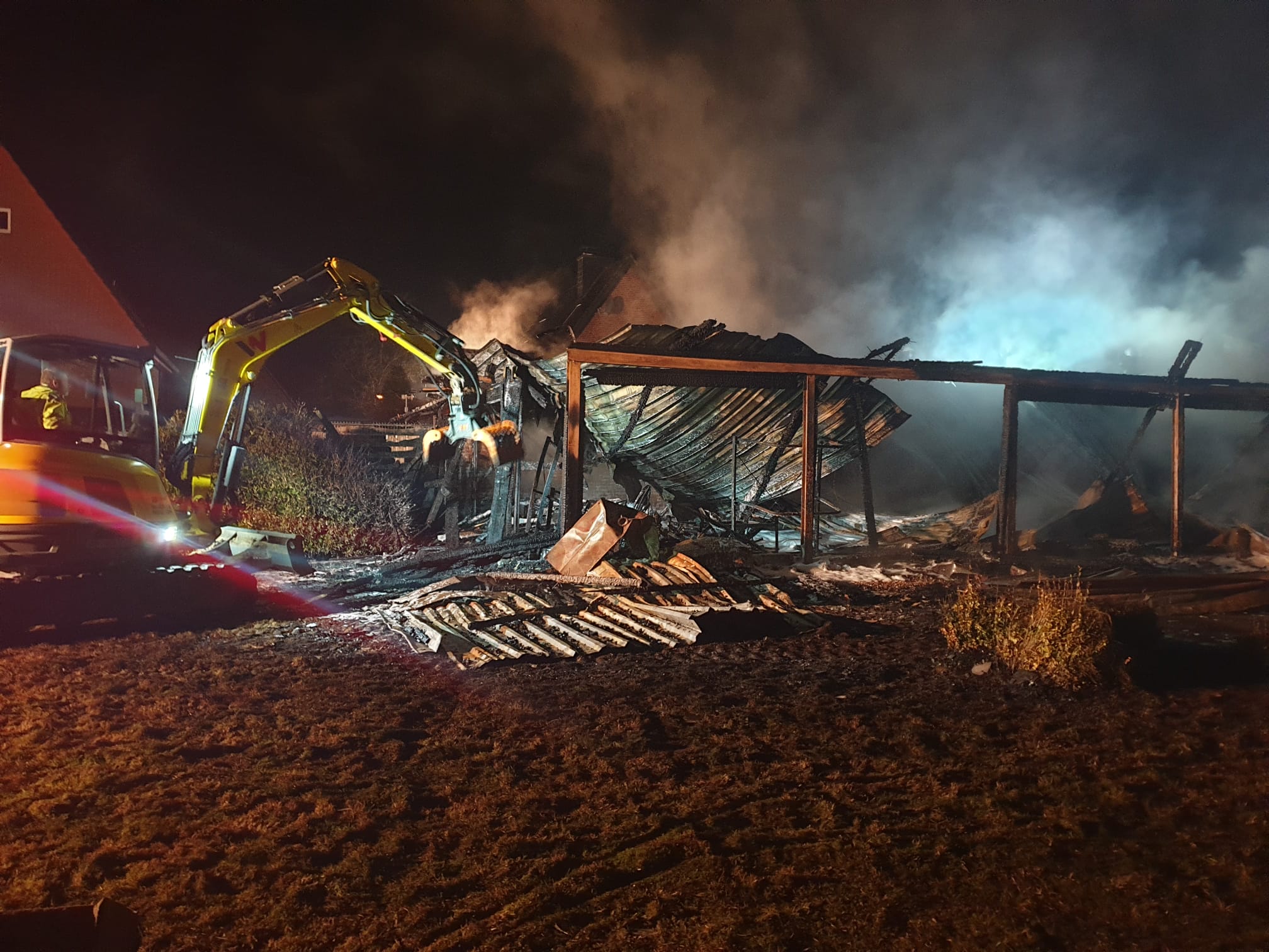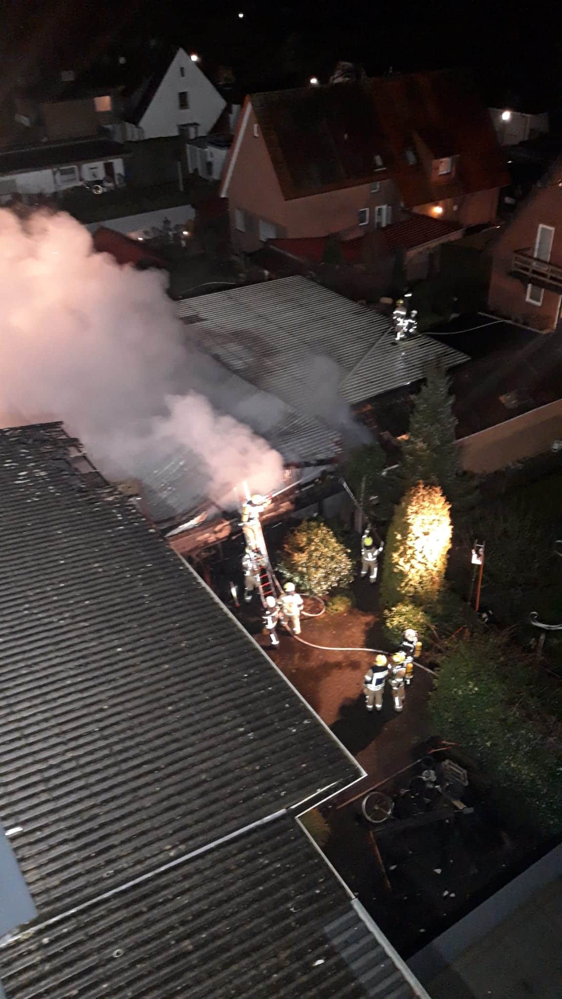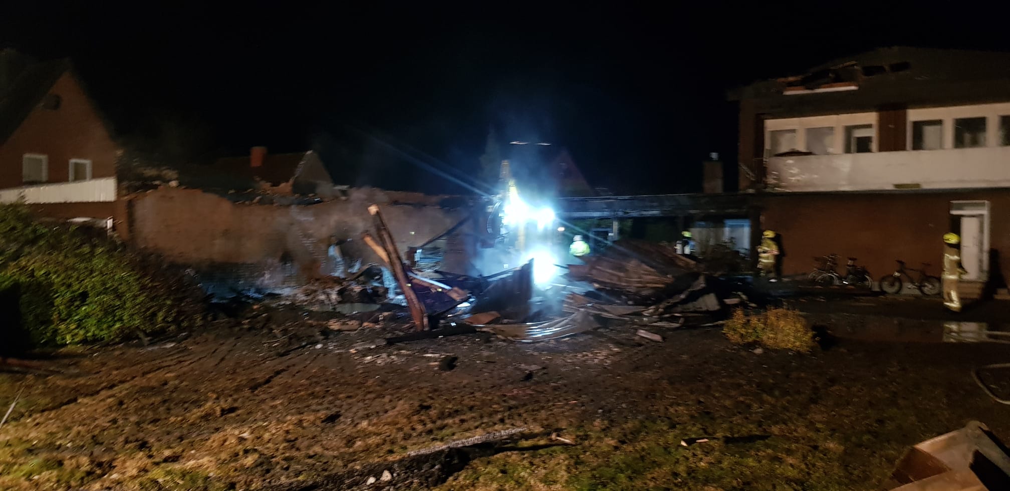 Schon in der Anfangsphase des Einsatzes wurde die Einsatzstelle in zwei Abschnitte unterteilt. In beiden Abschnitten wurde sofort ein B-Rohr zur Riegelstellung und Sicherung des Wohnhauses eingesetzt. Weitere 4 C-Rohre sowie das Wenderohr der Drehleiter waren aufgrund der engen Bebauung zur Sicherung und zum Löschen des Brandes eingesetzt. Wegen der enormen Hitzestrahlung hatte sich das Feuer in der Attika des Wohnhauses ausgebreitet. Hierzu wurde das THW Gronau alarmiert, die mit ihrer Hubarbeitsbühne und der Rettungssäge, Freiräume zum Löschen des Dachstuhles, herrichteten. Eine Mietwohnung im ersten Obergeschoß ist zur Zeit nicht mehr bewohnbar. Weiterhin kam die Fa. Terdenge mit einem Bagger zum Einsatz, um Glutnester unter dem eingestürzten Dach freizulegen.