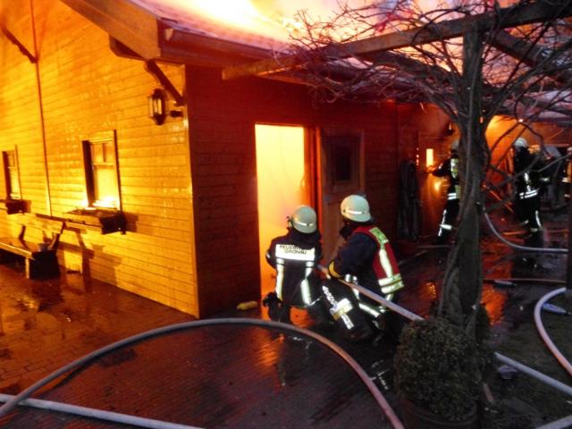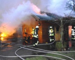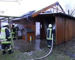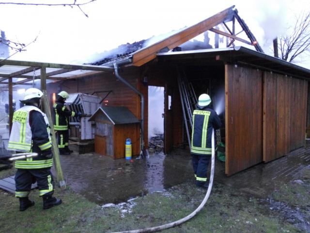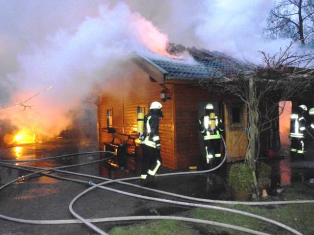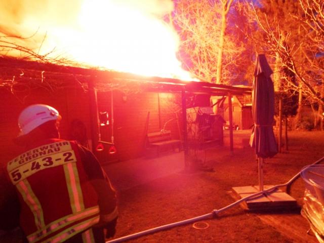 Um 06:15 h wurde die Feuerwehr Gronau zu einem Brand an der Füchter Straße gerufen. Dort brannte, lt. erster Meldung, eine Gartenhütte. Bei Eintreffen wurde dann festgestellt, dass es sich nicht um eine kleine Gartenlaube handelt, sondern um ein Garten- Blockhaus mit den Maßen von 7 x 12 Meter. Im vorderen Bereich konnten von der Feuerwehr noch diverse Motor- und Fahrräder geborgen werden. Aufgrund der Größe des Gebäudes sowie der großen Anzahl an Zugängen wurden zwei Brandabschnitte gebildet. Unter Einsatz von Atemschutz sowie mehreren C-Rohren konnte der Brand gelöscht werden. Die Brandursache sowie die Schadenshöhe werden von der Kriminalpolizei ermittelt.