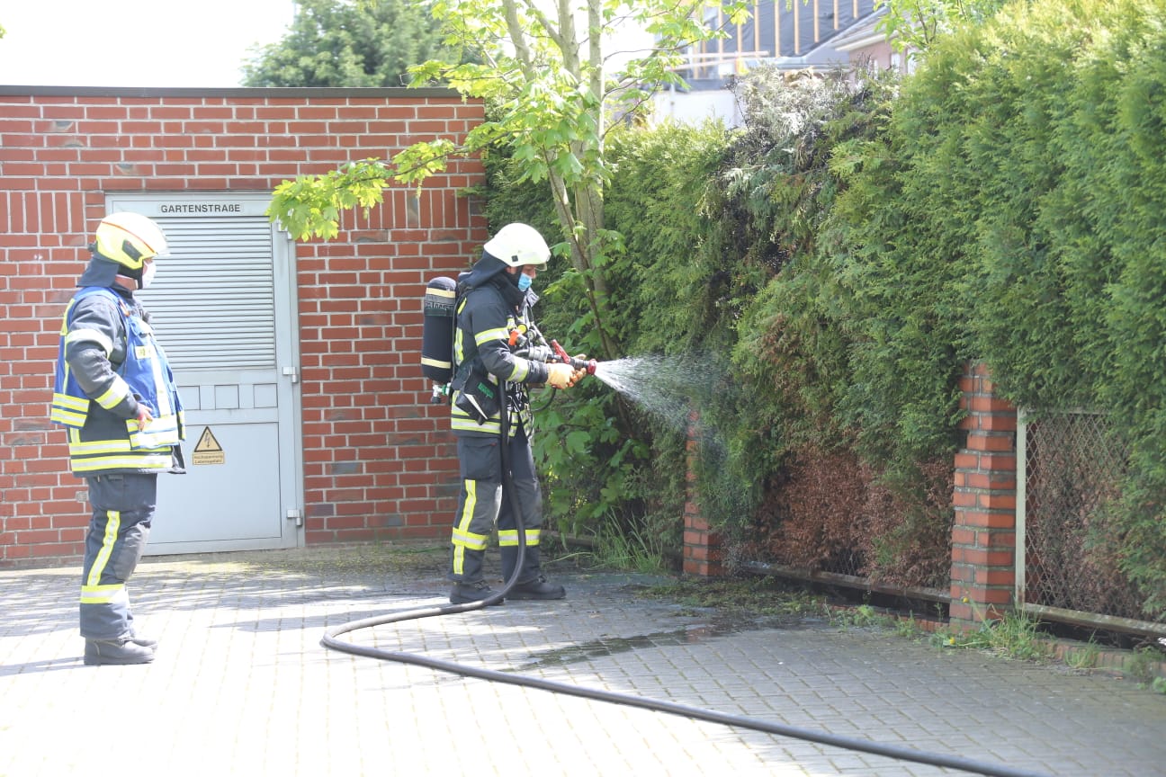 Am 01.05.2020 hatten Anwohner an der Gartenstrasse noch Glück. Hier blieb es nach dem Abflämmen beim Heckenbrand. Die Feuerwehr musste nur noch Glutnester ablöschen.