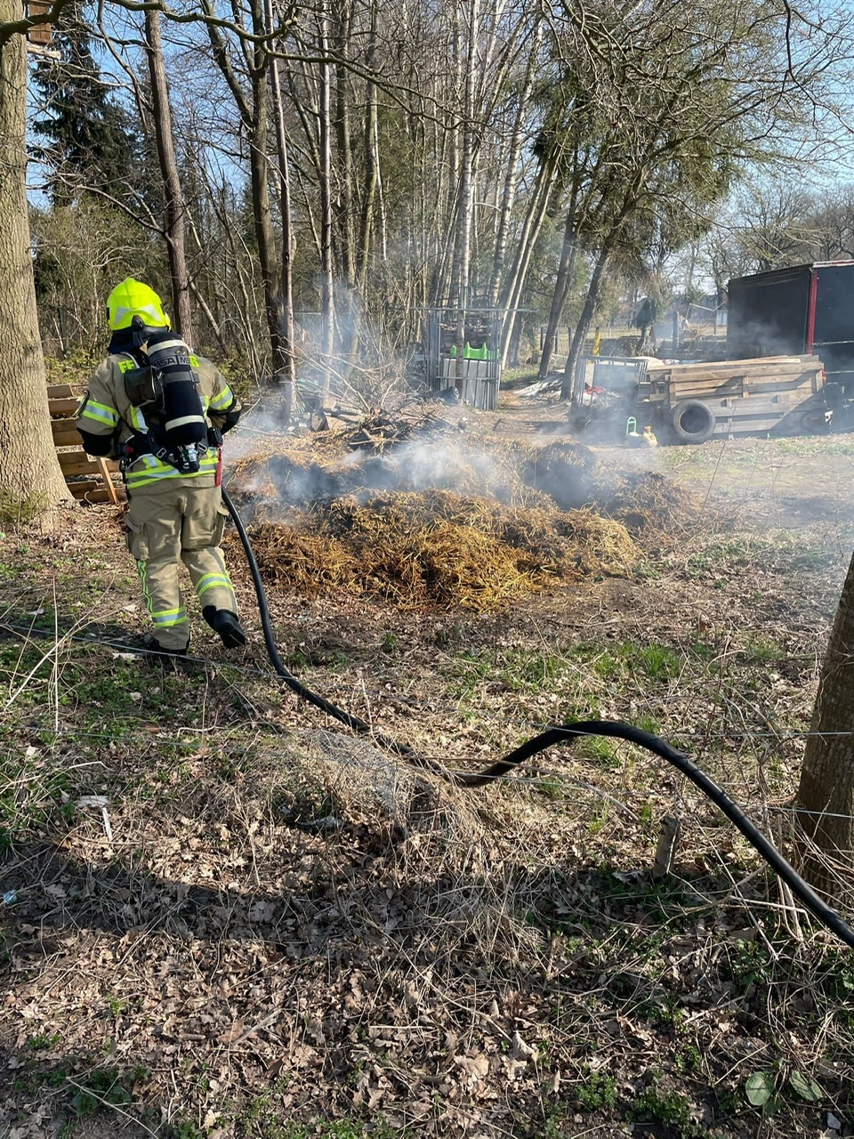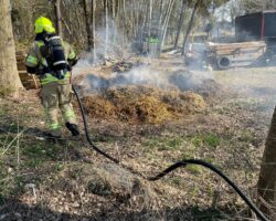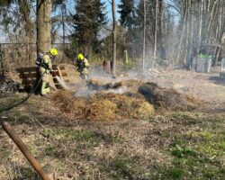 Die Feuermeldung kam gegen 12:05 h und gab ein „Feuer_klein“ im Außenbereich vor. Bei Eintreffen der Feuerwehr brannte Heu und Stroh auf einer Freifläche. Die Feuerwehr löschte mittels Wasser und natürlich unter Atemschutz den Brand. Auslöser für die Ursache des Brandes ist unbekannt.