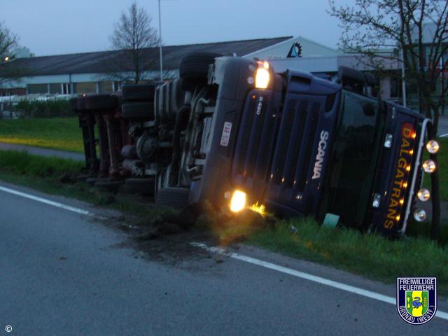 Nach ersten Meldungen sollte der Fahrer in seinem Lkw eingeklemmt sein, bei Eintreffen der Feuerwehr stellte sich heraus das er nicht eingeklemmt war.