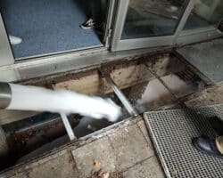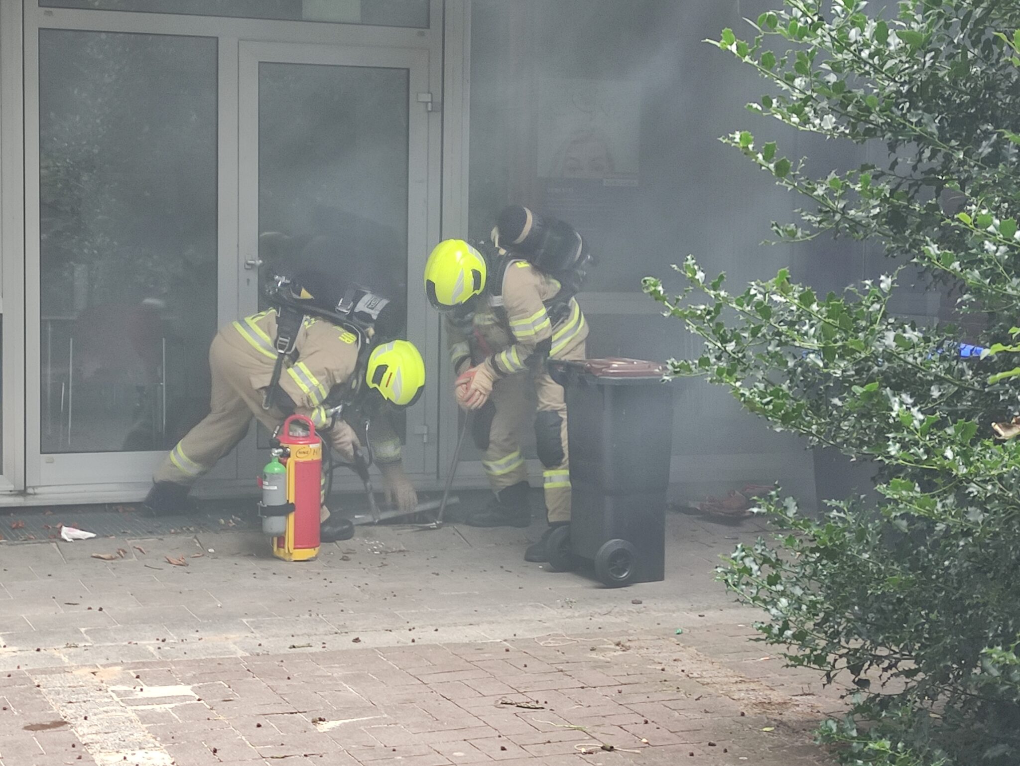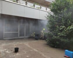 Eine diffuse Verrauchung wurde mit einem Hochleistungslüfter aus dem Ladenlokal gebracht. Zum Abschluss wurde mit einer Schaumpistole der Kellerschacht eingeschäumt.