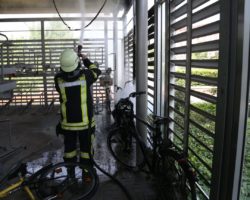 Am 01.06.19 wurde die Feuerwehr Gronau zu einem Kleinbrand in der Radstation am Bahnhof alarmiert. Dort angekommen wurde festgestellt, dass in der Radstation ein Motorroller in voller Ausdehnung brannte. Der Brand wurde mit einem C-Rohr unter Atemschutz abgelöscht. Die Verkleidung der Radstation wurde ebenfalls durch den Brand beschädigt.