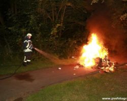 Als erstes wurde die Feuerwehr gegen 23:50 h in den Stadtpark Gronau gerufen. Dort hatten Unbekannte einen Kunststoff – Müllcontainer an der Berufsschule entwendet und im Bereich des alten Musikpavillons angezündet. Die Feuerwehr konnte den Brand durch Einsatz eines C-Rohres löschen. Die Polizei hat die Ermittlungen aufgenommen. Noch während der Aufräumarbeiten kam eine weitere Brandmeldung über die Kreisleitstelle. Im Bereich der Bleeke soll ein PKW brennen. Bei Eintreffen der Feuerwehr hatten Anwohner den im rechten Vorderbereich brennenden PKW bereits abgelöscht. Die Feuerwehr klemmte die Batterie des Fahrzeuges ab, da mehrere Kabel offen im Motorraum lagen.
