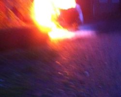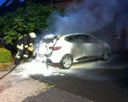 Dann um 04:50 h wurde die Feuerwehr Gronau zum zweiten Mal zur Bleeke gerufen. Derselbe Wagen stand dieses Mal in Vollbrand. Hatte der PKW beim ersten Mal noch vorne rechts gebrannt, stand dieses Mal das gesamte Heck mit Innenraum in Flammen. Durch Einsatz eines Schaumrohres wurde der Brand abgelöscht. Nach Auskunfrt der Eigentümer war das fabrikneue Fahrzeug 14 Tage alt. Die Kriminalpolizei ermittelt hier natürlich auch bezüglich der Brandursache.