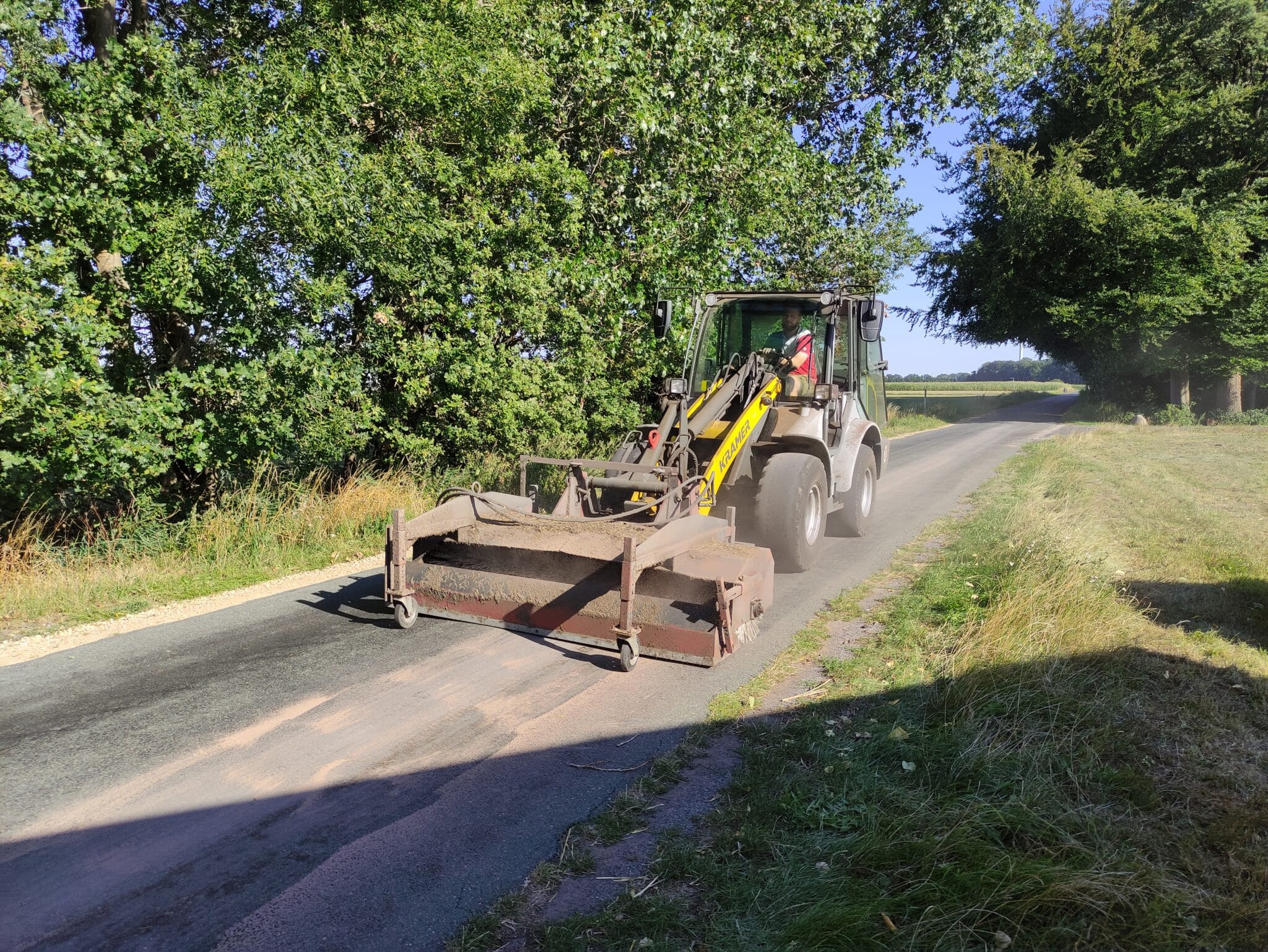 Dankenswerter Weise hat ein ortsansässiger Landwirt mit seinem Radlader und einer Kehrmaschine geholfen, das Bindemittel mit vereinten Kräften wieder aufzunehmen.