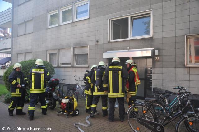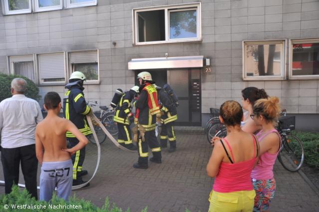 Mit dem Stichwort MIG-Alarm wurde die Feuerwehr Gronau durch die Kreisleitstelle Borken alarmiert. Bei Eintreffen der Feuerwehr standen bereits mehrere Personen draußen, einige Bewohner standen an den Fenstern des Treppenflures und zwei Personen saßen bereits auf dem Fenstersims.