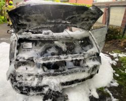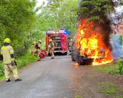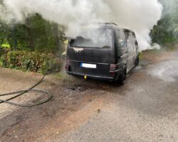 Während der Fahrt bemerkte der Fahrer eines VW T4 Transporters Rauch aus dem Motorraum des Fahrzeuges. Er konnte das Fahrzeug auf der Industriestraße, in Höhe der Overberg Schule, unverletzt verlassen und die Feuerwehr alarmieren.