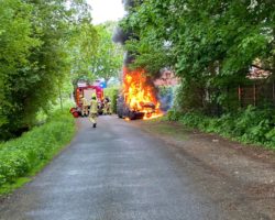 Bei Eintreffen der Feuerwehr stand der Transporter in Vollbrand. Mittels des Schnellangriffs wurde der Brand durch den Angriffstrupp unter PA gelöscht. Anschließend wurde das Fahrzeug eingeschäumt, um Rückzündungen zu verhindern. Der in der Nähe der Einsatzstelle stehende Baum wurde durch den Brand in Mitleidenschaft gezogen.