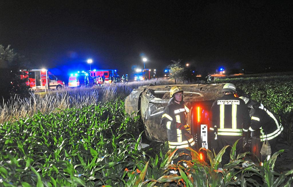 Zwischen Gronauer Straße und Amtsvennweg hatte ein amerikanischer Staatsbürger die Kontrolle über einen gemieteten Audi A5 verloren und war 30 Meter neben der Fahrbahn auf der Seite in einem Maisfeld zum Liegen gekommen. Der leichtverletzte Mann konnte das verunfallte Fahrzeug selbstständig verlassen, gab aber an, dass er auf dem Beifahrersitz gesessen habe. Aus diesem Grunde suchte die Feuerwehr mit Wärmebildkameras die Umgebung ab. Auch ein Polizeihubschrauber kam zum Einsatz. Es konnte aber keine weitere Person gefunden werden. Aufgrund diverser Gegenstände im verunfallten Fahrzeug wurde der Unfallverursacher von der Polizei in Gewahrsam genommen.