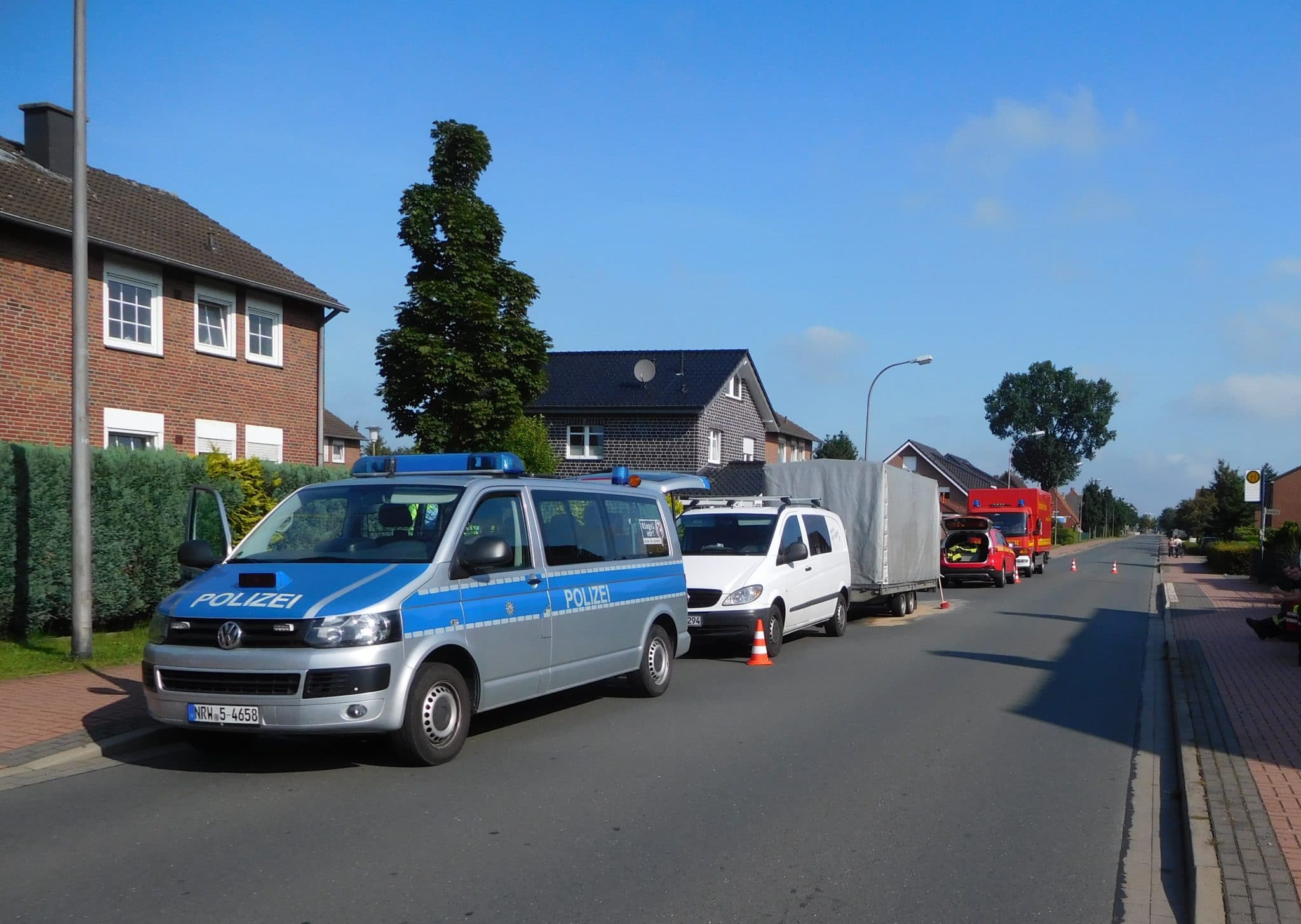 Kurz nach 08:30 h stoppte die Polizei ein Fahrzeuggespann auf dem Heerweg. Der Fahrer war aufgrund seiner vorsichtigen Fahrweise sowie tropfender Flüssigkeit vom Anhänger den Beamten aufgefallen. Als sie das Gespann unter die Lupe nahmen, fiel ihnen auf, dass mehrere Fässer sich auf dem Anhänger befanden. Aufgrund der unklaren Lage, um was es sich für eine Flüssigkeit handelt und wie viel Liter geladen sind, wurde die Feuerwehr alarmiert.