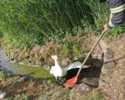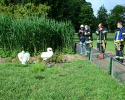 Die Feuerwehr Gronau wurde am Sonntagmorgen zu einer Hilfeleistung „Tier in Notlage“ gerufen worden. Im Eper Park war ein Schwanenküken im Abfluss des Parkteiches geraten und kam dort nicht mehr heraus. Die tierischen Versuche der Eltern waren auch nicht von Erfolg gekrönt. Besucher des Parks alarmierten die Feuerwehr. Mit einer Schaufel wurde das Jungtier vorsichtig – trotz fauchender Schwanenmutter – aus der Gefahrensituation befreit. Glücklich wiedervereint nahm die Schwanenfamilie ein Bad im Teich.