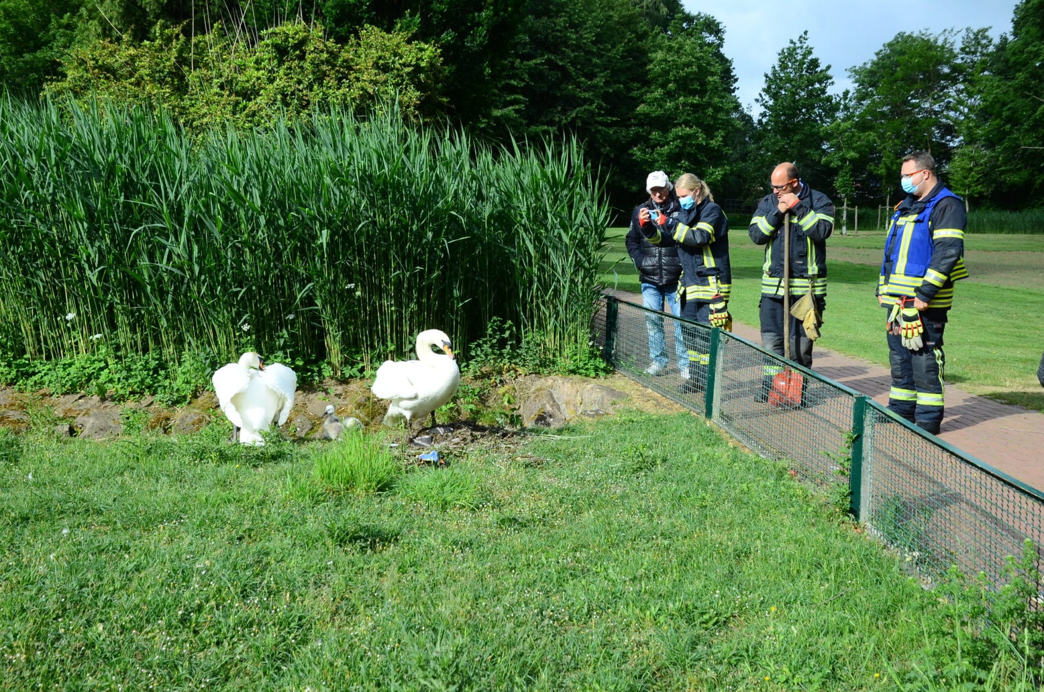 Die Feuerwehr Gronau wurde am Sonntagmorgen zu einer Hilfeleistung „Tier in Notlage“ gerufen worden. Im Eper Park war ein Schwanenküken im Abfluss des Parkteiches geraten und kam dort nicht mehr heraus. Die tierischen Versuche der Eltern waren auch nicht von Erfolg gekrönt. Besucher des Parks alarmierten die Feuerwehr. Mit einer Schaufel wurde das Jungtier vorsichtig – trotz fauchender Schwanenmutter – aus der Gefahrensituation befreit. Glücklich wiedervereint nahm die Schwanenfamilie ein Bad im Teich.