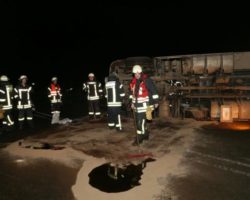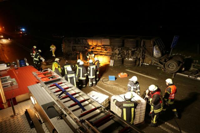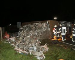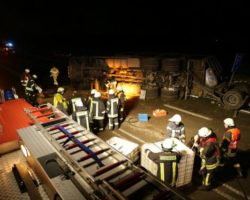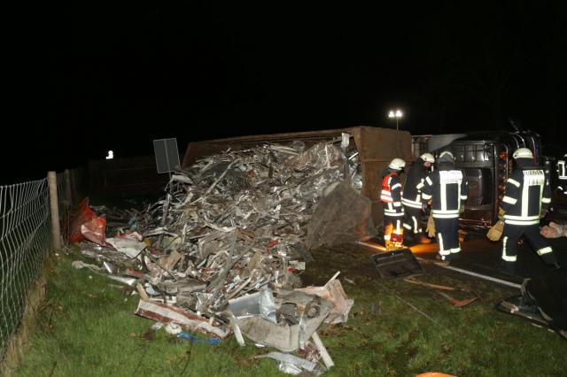 Gronau (ots) – Am 02.02.2016 kam es gegen 18.12 Uhr in Gronau auf der B 54 zu einem schweren Verkehrsunfall. Ein Lkw, der die B 54 von den Niederlanden aus kommend in Richtung Münster befuhr, kam zwischen den Anschlußstellen Amtsvennweg und Gronauer Straße aus bislang ungeklärter Ursache von der Fahrbahn ab und geriet ins Schleudern. Anschließend kippte der Lkw um und verlor seine Ladung. Ein Pkw wurde von dem schleudernden Lkw erfasst und ebenfalls beschädigt. Bei dem Verkehrsunfall wurden zwei Personen leicht verletzt. Für die Dauer der Bergung erfolgt eine Vollsperrung der B 54. Diese wird noch mehrere Stunden andauern.