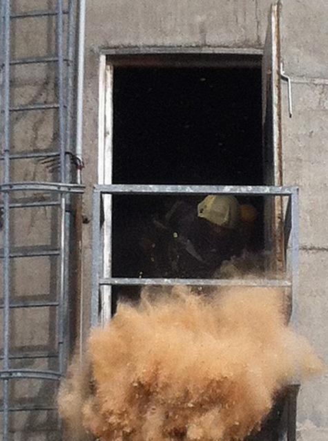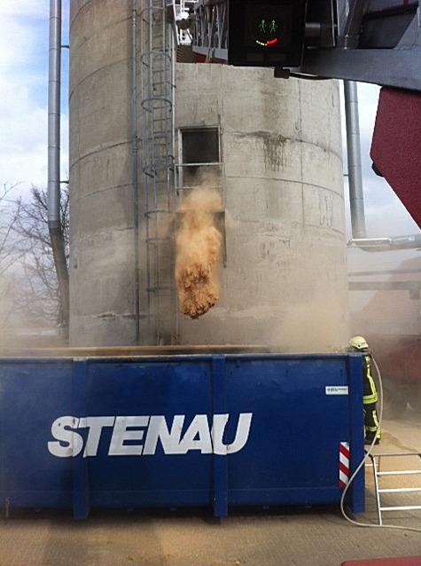 Der Inhalt des Spänebunkers wurde zunächst mit einem Netzmittel abgelöscht. Nach dem Ausräumen wurden die brennenden Holzspäne mit Schaummittel endgültig erstickt.