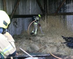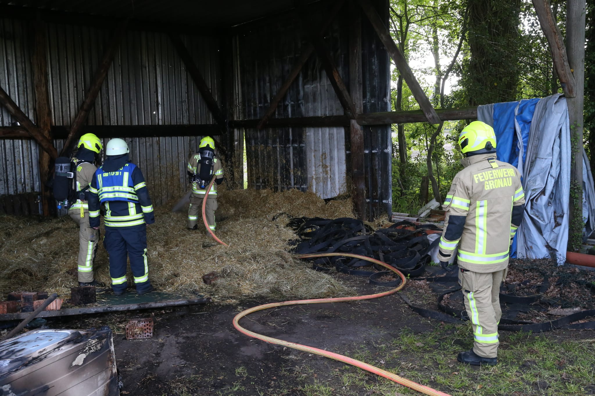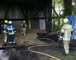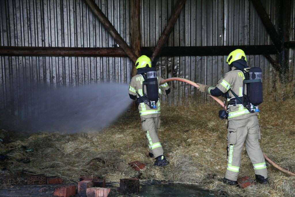 Die brennenden Strohballen konnten unter Einsatz von Atemschutzgeräten abgelöscht werden. Die Wasserversorgung erfolgte über die Fahrzeugtanks.