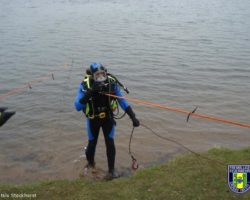 Am Freitag vormittag kam es im zuge einer Amtshilfe für die Polizei zu einem Einsatz für die Taucherstaffel der Feuerwehr Gronau. Spaziergängern am Drilandsee waren Reifenspuren aufgefallen, die vom Hügel aus direkt in den See führten. Auf Grund dieser Aussage, alarmierten die Polizeibeamten die als erstes vor Ort waren, die Taucherstaffel der Feuerwehr Gronau. Man ging davon aus, dass es sich um einen am Vorabend entwendeten PKW handelte. Als die Taucher der Feuerwehr Gronau eintraffen und der erste Taucher im Wasser war um nach dem Fahrzeug zu suchen, war dieses auch schnell gefunden. Nun mußten Taucher das Auto mit Drahtseilen versehen, um eine Bergung durch ein Abschleppunternehmen zu ermöglichen. Nach erfolgreicher Bergung wurden die aus dem Fahrzeug auslaufenden Betriebsstoffe mit speziellen Bindemitteln aufgefangen.