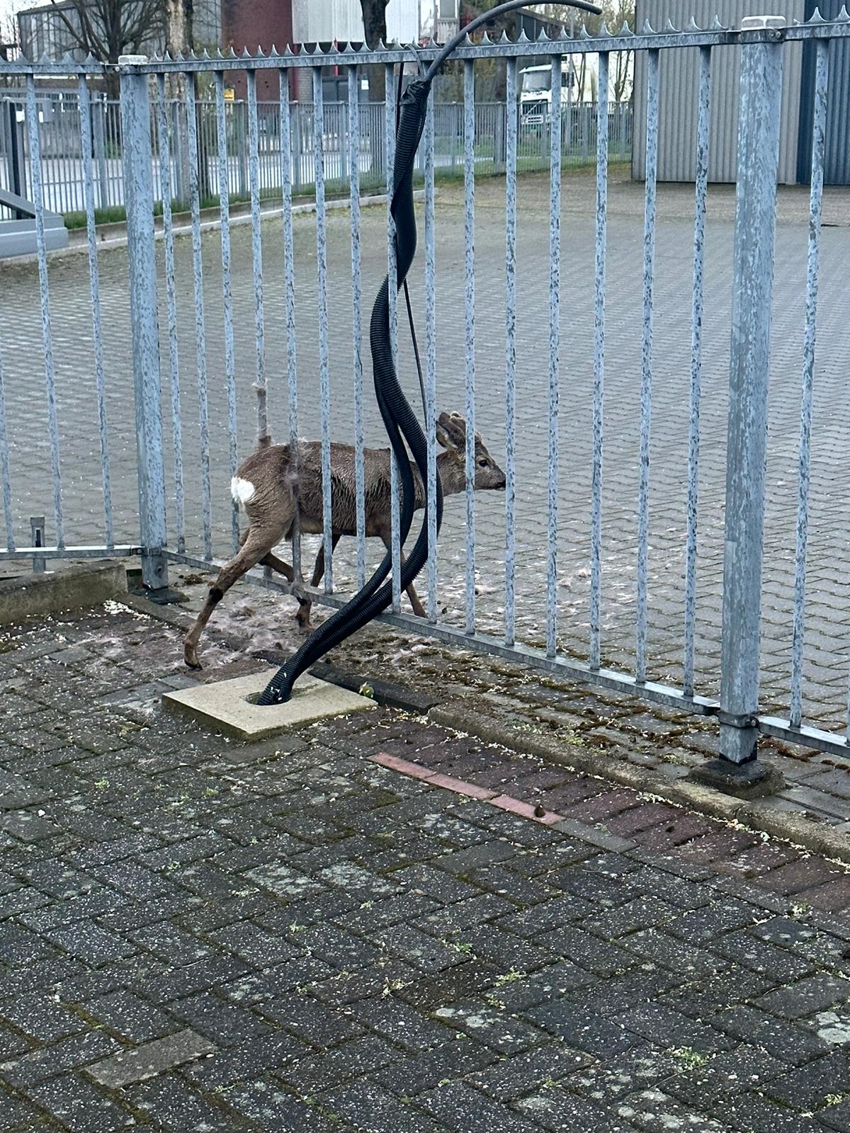 Nach der Erkundung wurde bei einem Gewerbebetrieb ein Reh gefunden, das in einem Zaun festklemmte und sich selbständig nicht mehr befreien konnte.